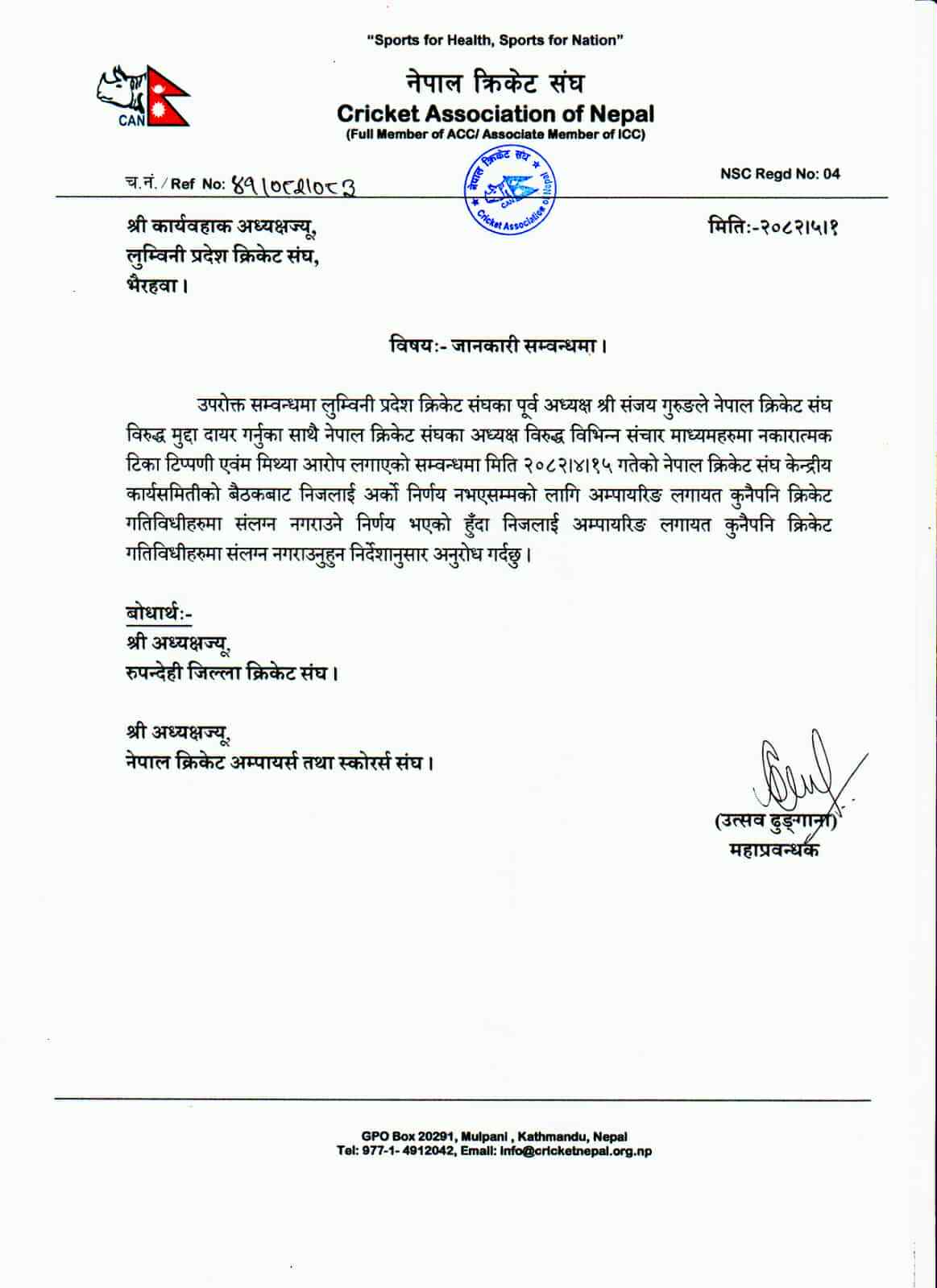 रुपन्देही जिल्ला क्रिकेट संघ र नेपाल क्रिकेट अम्पायर्स तथा स्कोरर्स संघलाई बोधार्थ दिदै लेखिएको पत्रमा भनिएको छ–’लुम्बिनी क्रिकेट संघका पूर्व अध्यक्ष श्री संजय गुरुङले नेपाल क्रिकेट संघ विरुद्ध मुद्दा दायर गर्नुका साथै नेपाल क्रिकेट संघका अध्यक्ष विरुद्ध विभिन्न संचार माध्यमहरुमा नकारात्मक टिका टिप्पणी एवं मिथ्या आरोप लगाएको सम्बन्धमा मिति २०८२ ।४। १५ गते बसेको नेपाल क्रिकेट संघको केन्द्रीय कार्यसमितिको बैठकबाट निजलाई अर्को निर्णय नभएसम्मको लागि अम्पायरिङ लगायत कुनैपनि क्रिकेट गतिविधिहरुमा संलग्न नगराउने निर्णय भएको हुदा निजलाई अप्पायरिङ लगायत कुनैपनि क्रिकेट गतिविधिहरुमा संलग्न नगराउनुहुन निर्देशन अनुसार अनुरोध गर्दछु ।’