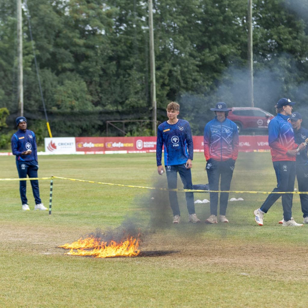 टस नै वर्षाका कारण ढिलो भयो। पिचमा भिजेको भागलाई ग्राउन्डस्टाफले अनौठो तरिका अपनाउँदै आगो लगाएर सुकाउने प्रयास गरे पनि बारम्बारको पिच निरीक्षणपछि खेल अन्ततः रद्द गरियो।