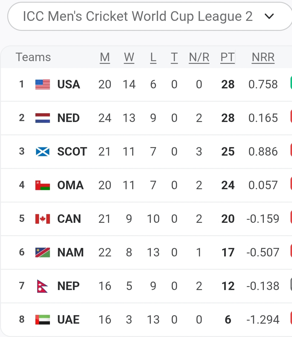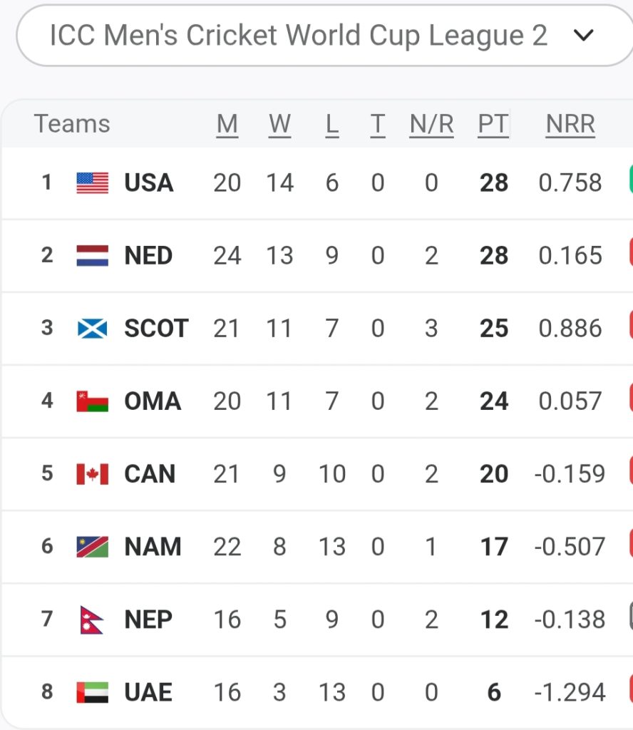 क्रिकेट वर्ल्ड कप लिग–२ अन्तर्गतको यो चरण बुधवार सुरु भएको हो, जसमा नामिबियाले क्यानाडालाई ५ विकेटले हराएको थियो।