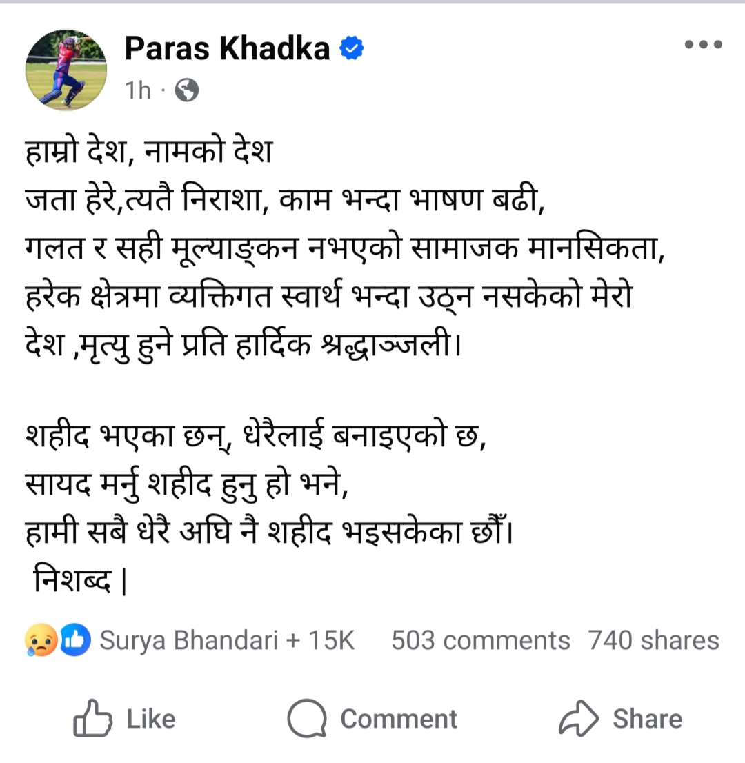 राष्ट्रिय क्रिकेट टोलीका पूर्व कप्तान समेत रहेका खड्काले हरेक क्षेत्रमा व्यक्तिगत स्वार्थ भन्दा उठ्न नसकेको मेरो देश भन्दै व्यंग्य गरेका छन्।