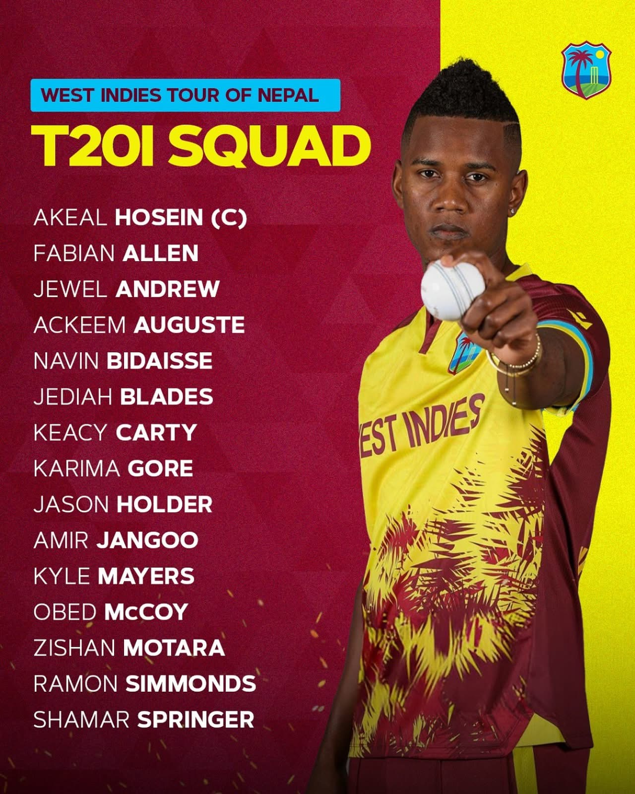 दोस्रो रोजाईका खेलाडीलाई मौका दिएको टोलीमा स्पिनर अकिल हुसेनले कप्तानी गर्नेछन् । अकिलसँगै ओपनर कायल मेयर्स, अनुभवी अलराउण्डर जेसन होल्डर र ओबेम म्याककोय टोलीमा समेटिएका छन् ।