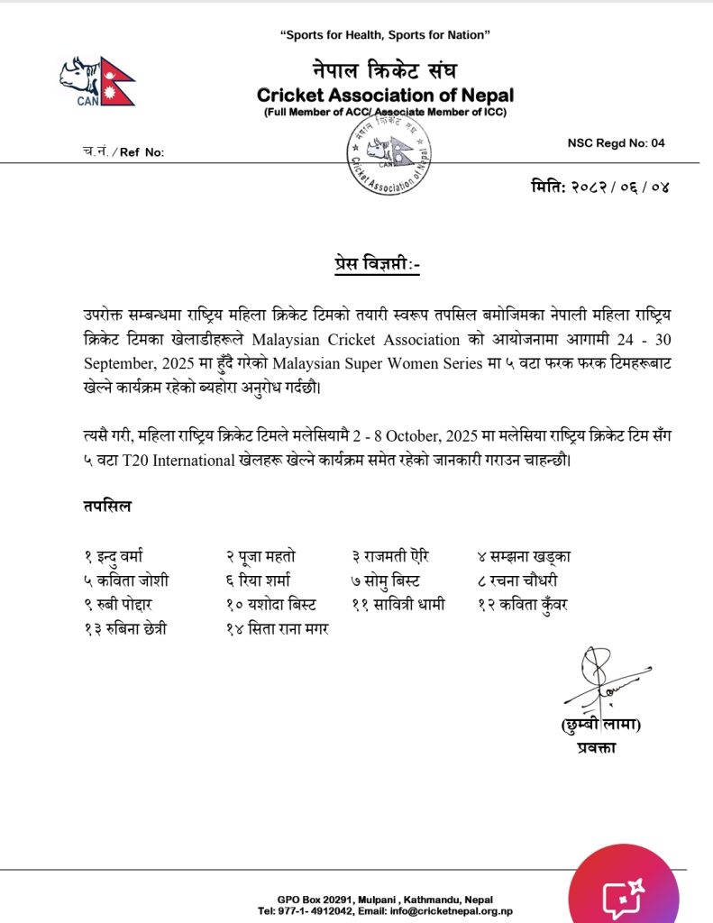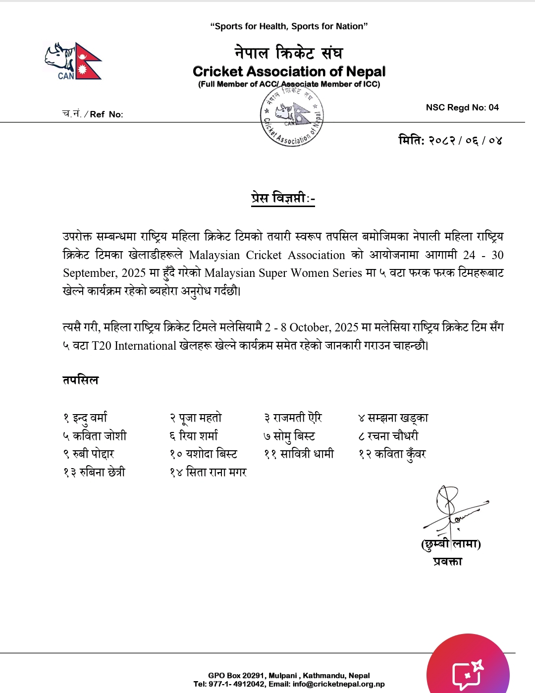 मलेसियासँगको सिरिज र सुपर सिरिजका लागि नेपाल क्रिकेट संघ (क्यान) शनिवार १४ सदस्यीय टोलीको घोषणा गरेको छ।