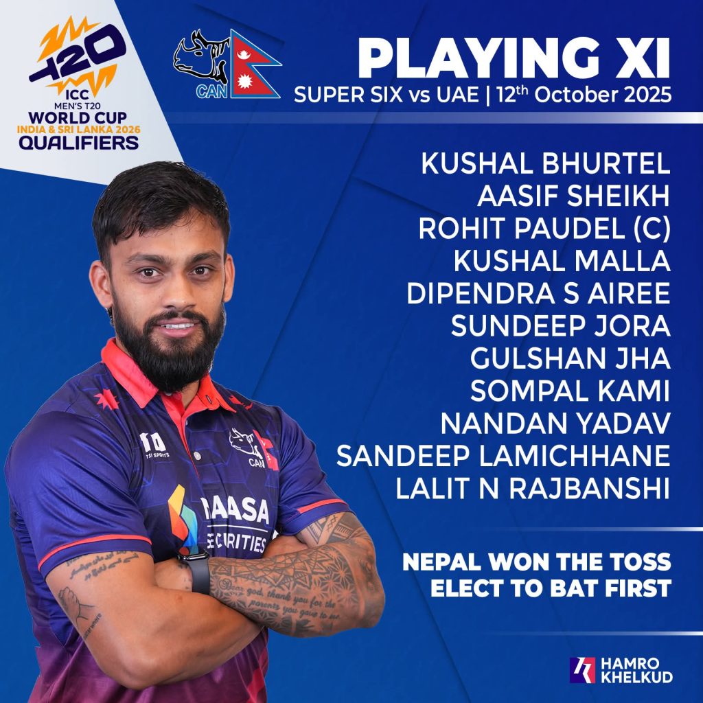 मस्कट (हाम्रो खेलकुद)- नेपालले आइसिसी पुरुष टि ट्वान्टी एसिया तथा इस्ट एसिया–प्यासिफिक छनोटको सुपर सिक्समा आज संयुक्त अरब इमिरेट्स (युएई) विरूद्ध टस जितेर पहिले ब्याटिङ गर्ने भएको छ।