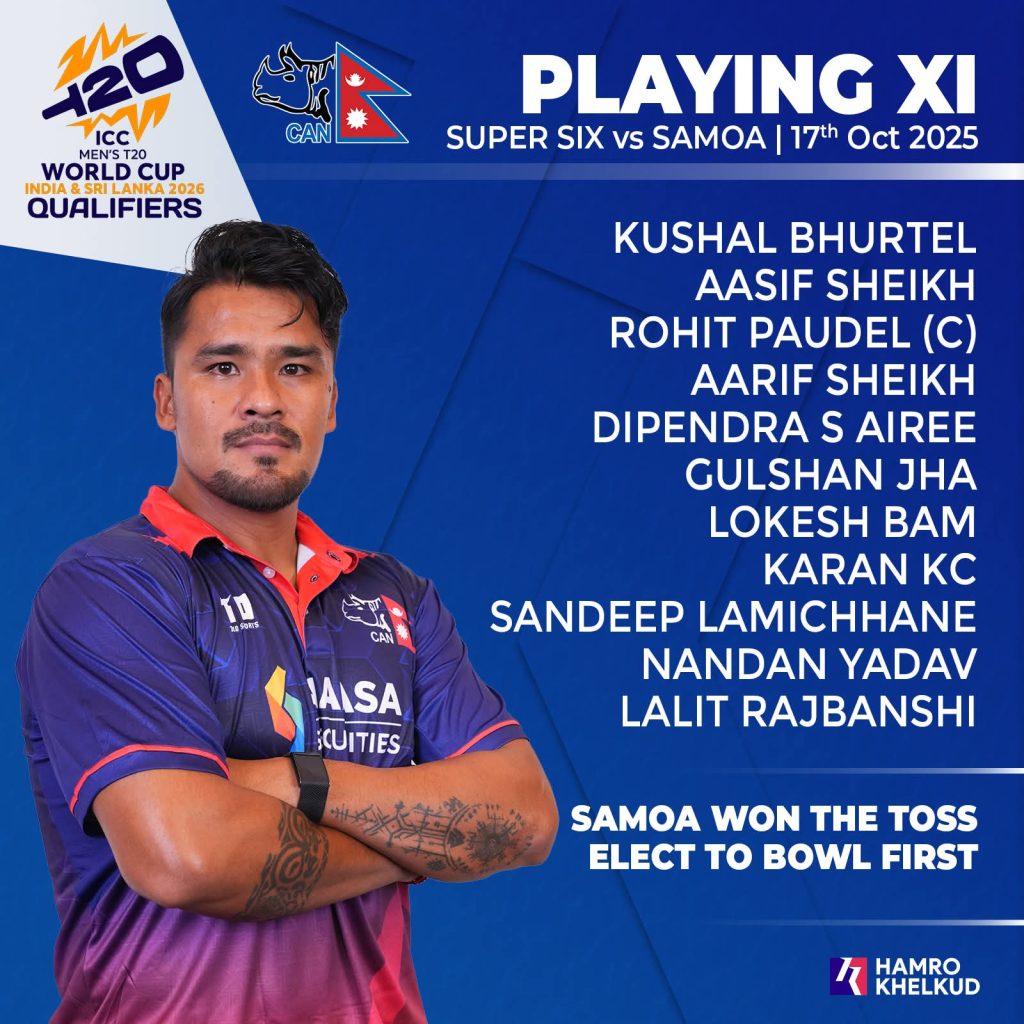 सामोआले टस जितेर फिल्डिङ रोजेपछि नेपालले ब्याटिङ गर्न लागेको हो।