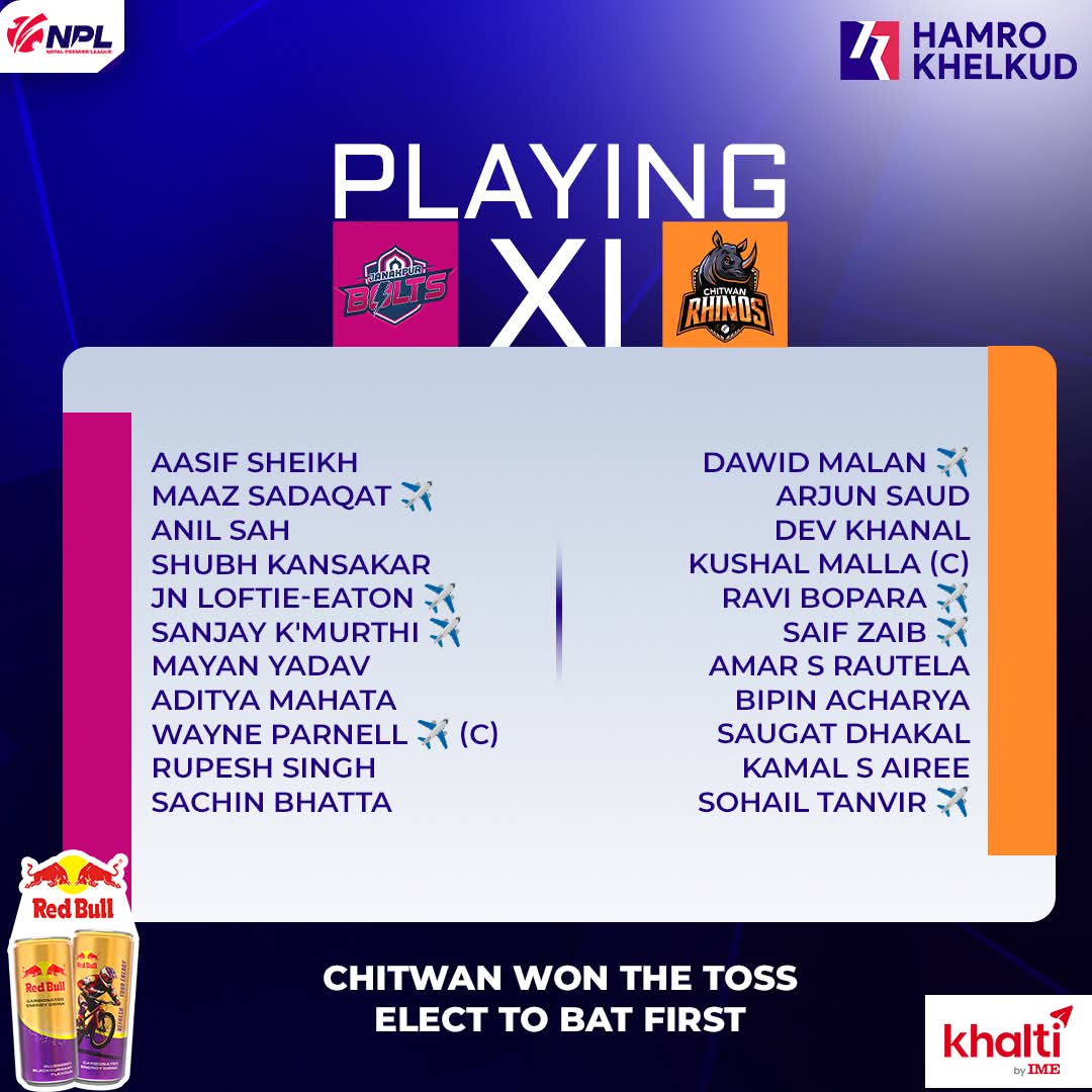 टियु क्रिकेट स्टेडियममा टस जितेर चितवनका कुशल मल्लले पहिले ब्याटिङ रोजे। चितवन र जनकपुरले दुबै टोलीले दुई परिवर्तन गरेका छन्। जनकपुरले कप्तानमा वायन पार्नेललाई नै निरन्तरता दिंदा ललित नारायण राजवंशी र किशोर महतोलाई ड्रप गरेको छ। अनिल शाह र सविन भट्टलाई प्लेइङमा राखेको छ ।