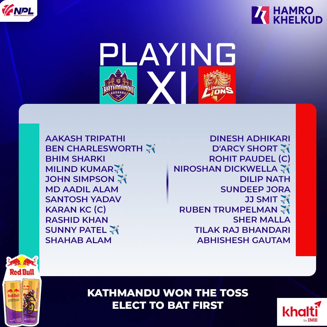 काठमाडौंका कप्तान करण केसीले टस जितेर ब्याटिङ रोजेका छन् । रोहित पौडेलको कप्तानीमा रहेको लुम्बिनीले फिल्डिङ गर्नेछ।