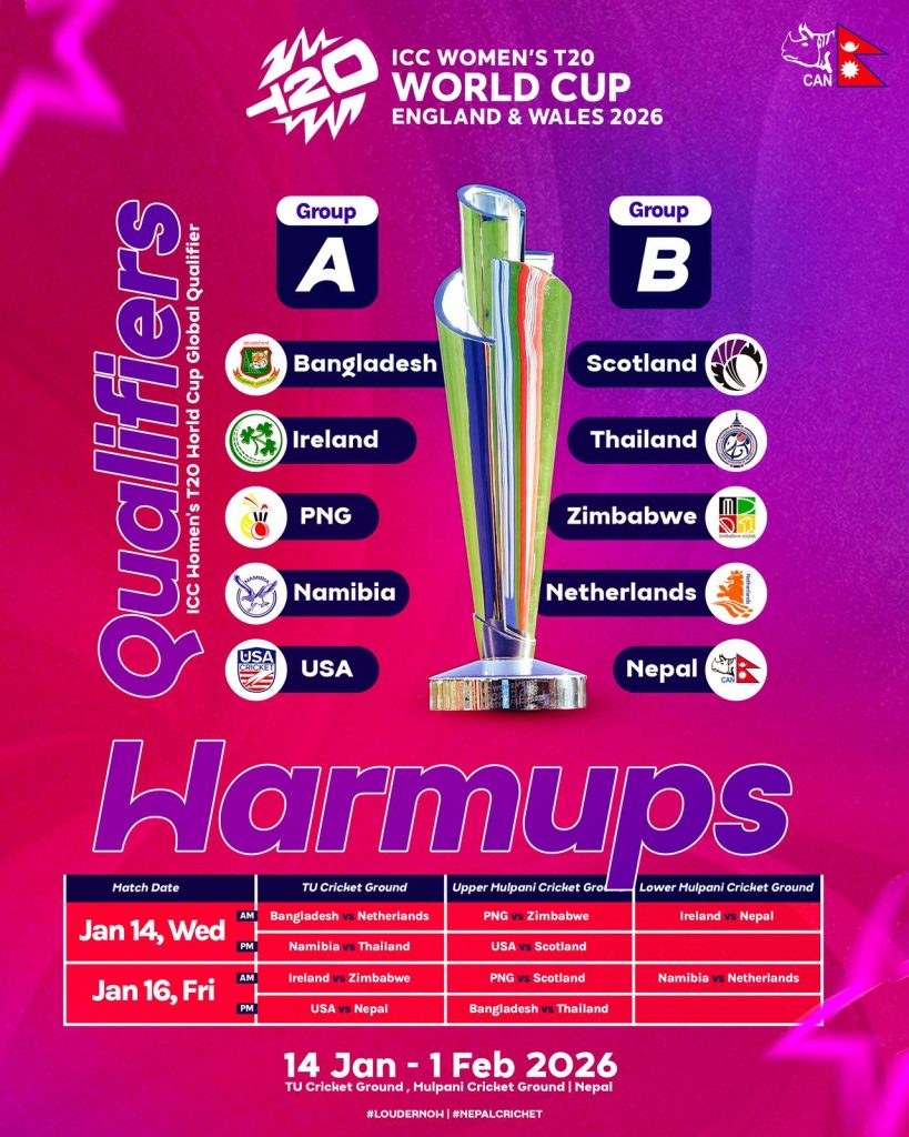 नेपालले पुस ३० गते (जनवरी १४) आयरल्यान्डसँग तल्लो मूलपानी र माघ २ गते (जनवरी १६) अमेरिकासँग कीर्तिपुरमा अभ्यास खेल खेल्नेछ ।