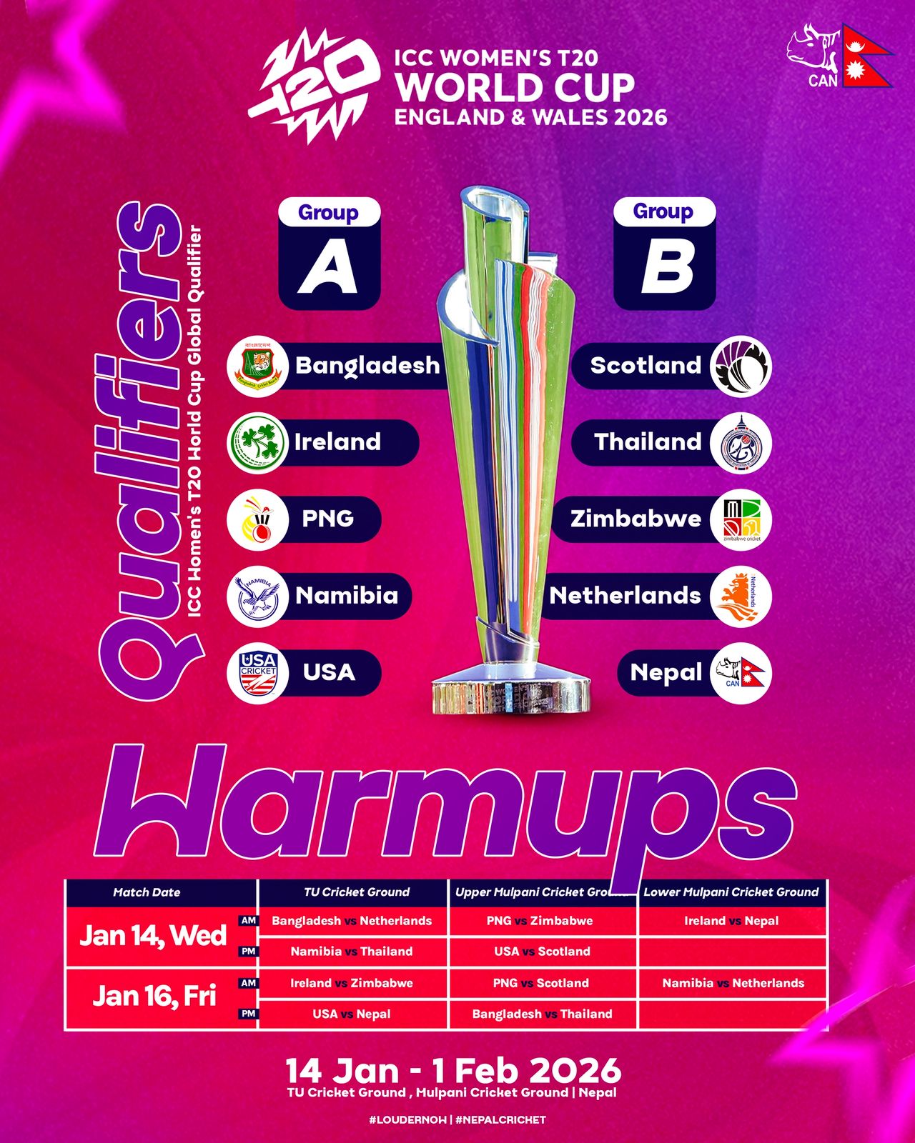 नेपाल, थाइल्याण्ड रहेको समूह ‘बी’ मा जिम्बावे, नेदरल्यान्ड्स र स्कटल्यान्ड छन् । समूह ‘ए’ मा बंगलादेश, आयरल्यान्ड, नामिबिया, पपुवा न्युगिनी र अमेरिका छन् ।