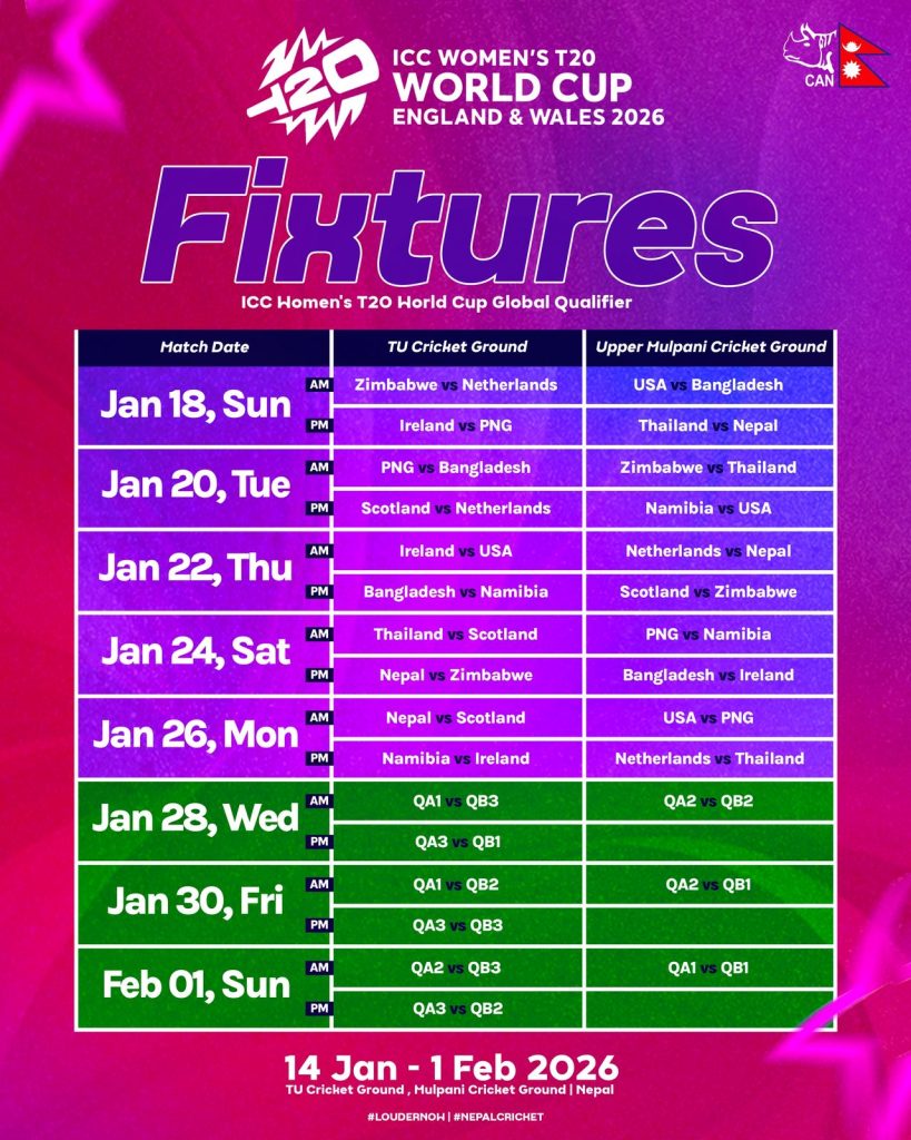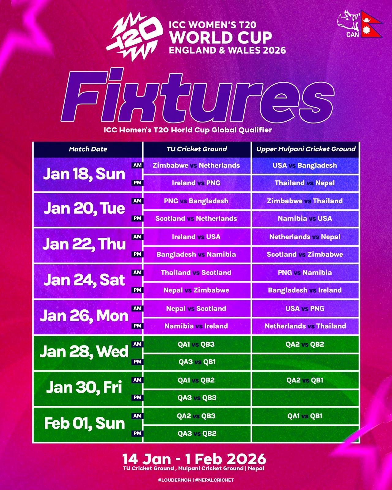 त्यसपछि ग्लोबल छनोटमा नेपालले माघ ४ गते (जनवरी १८ ) थाइल्यान्ड, माघ ८ गते ( जनवरी २२ ) नेदरल्यान्ड्स, माघ १० गते (जनवरी २४) जिम्बावे तथा समूह चरणको अन्तिम खेल माघ १२ गते ( जनवरी २६ ) स्कटल्यान्डसँग खेल्नेछ ।