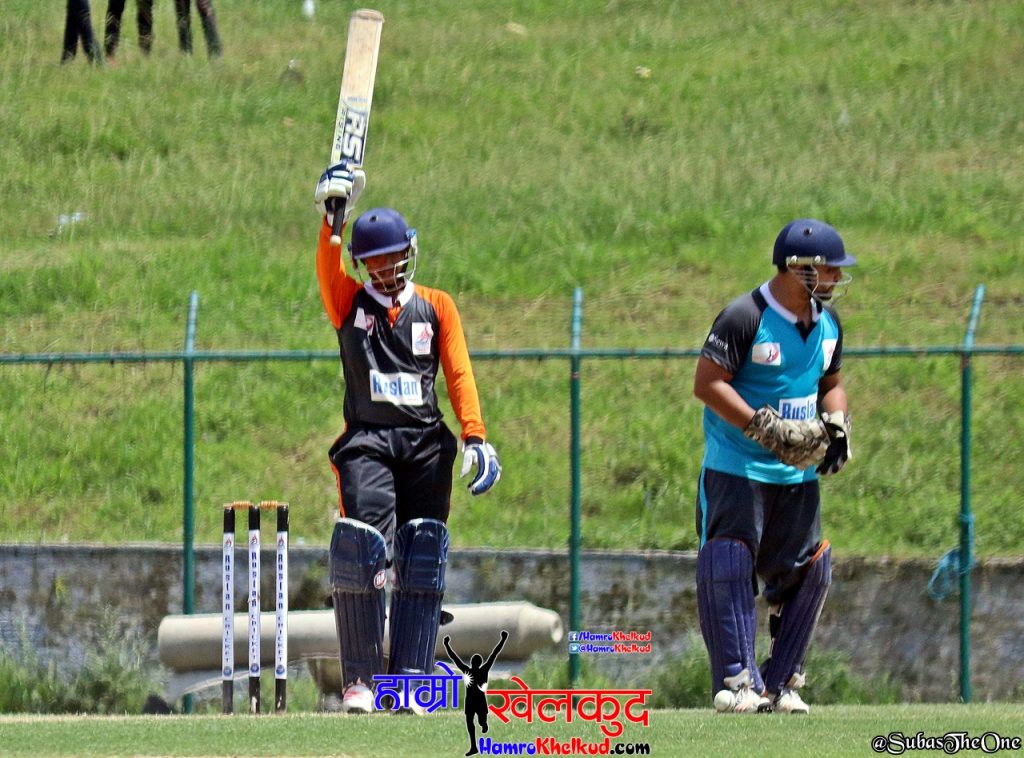 जवाफी ब्याटिङमा उत्रिएको एपीएफले पछिल्लो खेलमा अर्धशतकिय पारी खेलेका ओपनर सुबास खकुरेललाई १२ रनमा गुमाएपनि दोश्रो विकेटका साझेदारीले सुदृढ सुरुवात लियो। ओपनर सन्दिप सुनार र आसिफ शेखले १४ ओभरमा ९२ रनको साझेदारी गरेका थिए। आसिफले ४४ बलमा ३ चौका र १ छक्काको मद्दतले ४० रन जोडेका थिए। म्यान अफ द म्याच बनेका सन्दिप सुनारले आक्रामक ब्याटिङ गर्दै ८३ बलमा ८७ रन बनाए। उनले आफ्नो पारीमा ७ चौका र ५ छक्का प्रहार गरेका थिए। सन्दीपले ५५ बलमा आफ्नो अर्धशतक पुरा गरेका थिए। पृथु बास्कोटा १५ रन र प्रदिप ऐरी ५ रनमा अविजित रहेका थिए।