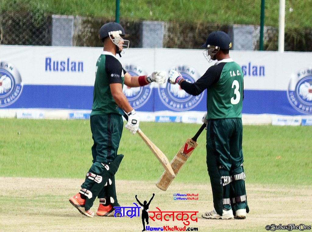 सौरभले ८६ बलमा दुई चौका र आठ छक्काको मद्दतमा ८२ रन बनाएका थिए । यस्तै कृष्ण कार्कीले ८९ बलमा दुई चौका र छ छक्काको मद्दतमा ७५ रन बनाएका थियो । नुरध्वज सेन २६ रन प्रकाश केसी १३ तथा विपिन खत्री १० रनमा अविजित रहे । अन्य ब्याट्सम्यानले राम्रो प्रदर्शन गर्न सकेनन् ।