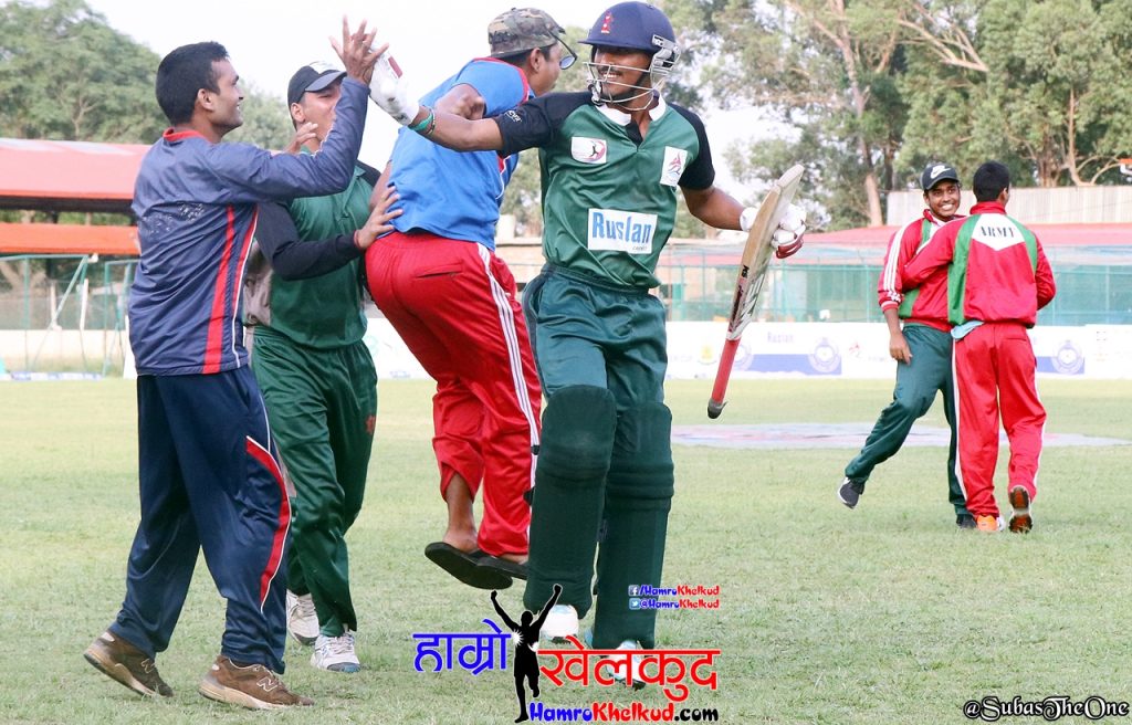 आर्मीका सोमपाल कामी, जितेन्द्र मुखिया, सागर पुन र साहव आलमले समान दुई–दुई विकेट लिए । सुसन भारीले एक विकेट लिए ।