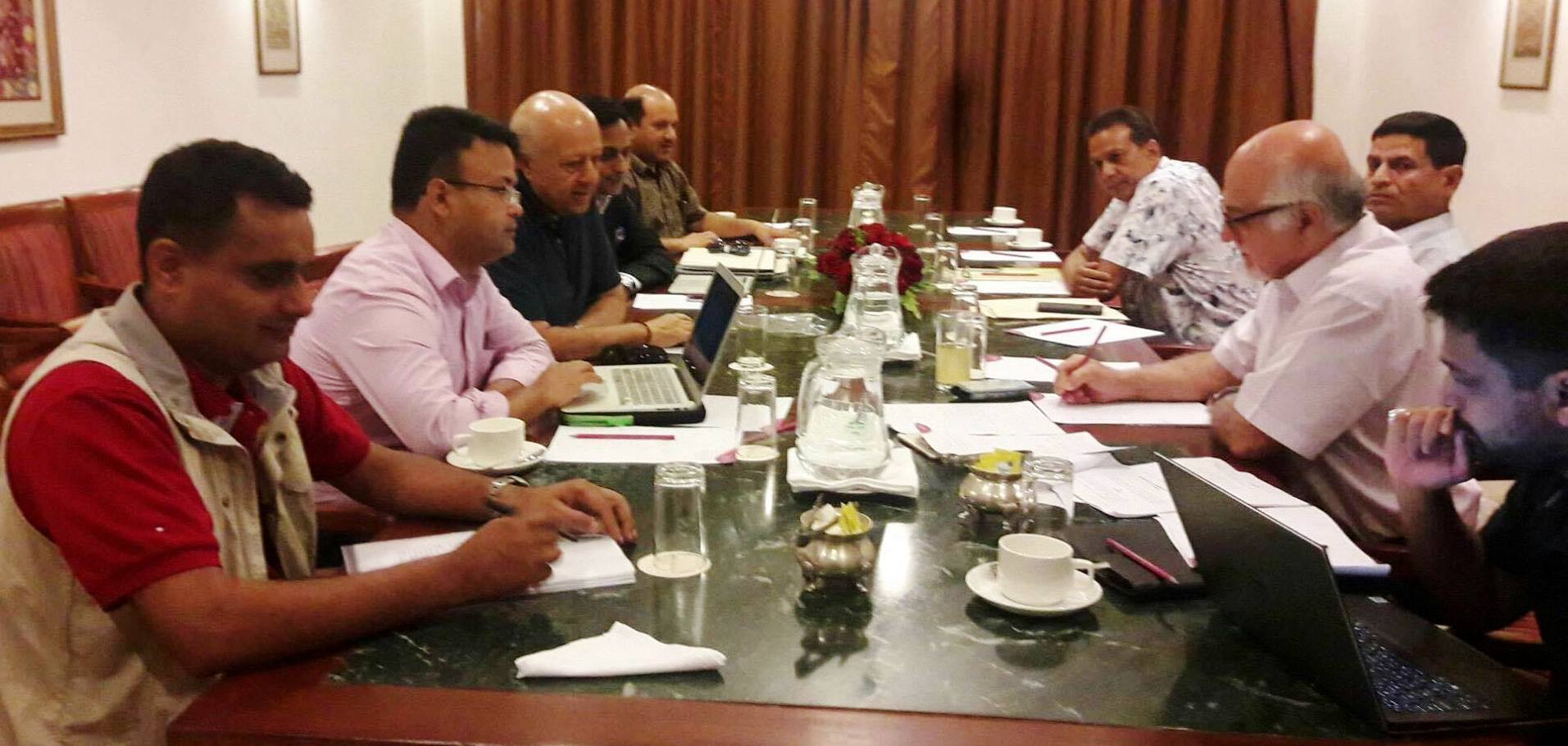 आइसिसीको प्रतिनिधि मण्डल क्रिकेट विवाद समाधानका लागि गठित सल्लाकार समितिको शनिबार राजधानीमा भएको बैठकका सहभागी । तस्बिरः समितिका सदस्य रोहित दाहालको फेसबुकबाट