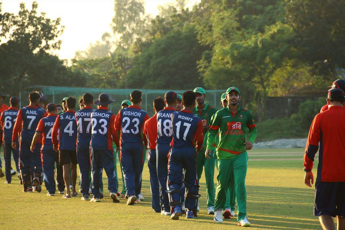 नेपालले यसअघिका दुई खेल ३ विकेट र १ सय २३ रनले गुमाएको थियो । आज बंगलादेशले दिएको २ सय २६ रनको लक्ष्य नेपाली टोलीले ४६.३ ओभरमा ४ विकेट गुमाएर पूरा ग¥यो । टोलीका लागि आसिफ शेखले अर्धतक पुरा गरे । आसिफले ९० रन जोडे । ८८ बल खेलेका उनले ९ चौका र ३ छक्का प्रहार गरे ।