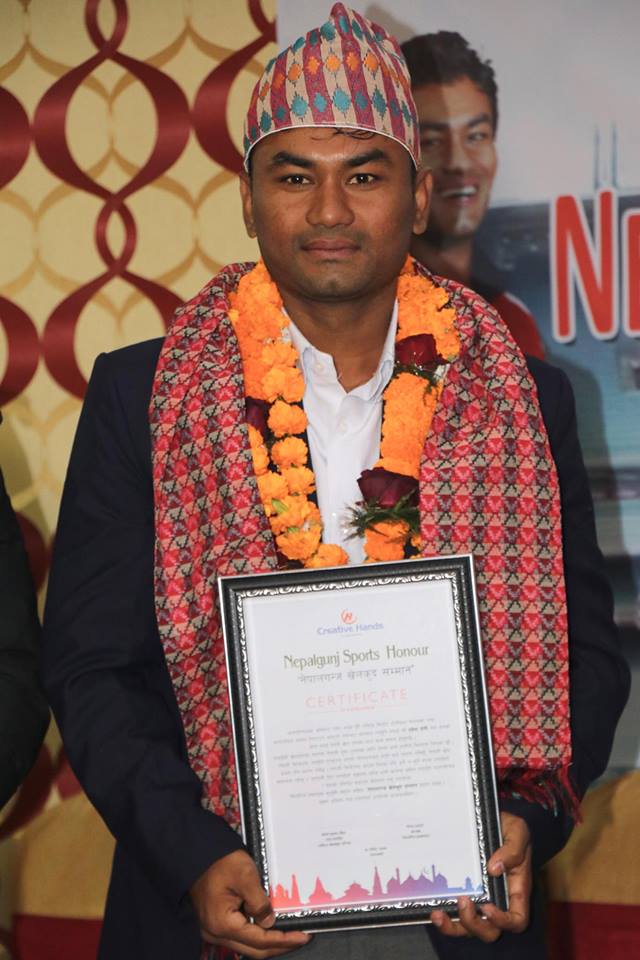 काठमाडौं (हाम्रो खेलकुद) – क्रिएटिभ ह्याण्डसले नेपाली राष्ट्रिय क्रिकेट टोलीका सदस्य महेश क्षेत्रीलाई नेपालगञ्ज स्पोर्टस अनरले सम्मानित गरेको छ । आयोजक क्रिएटिभ ह्याण्डस्ले शुक्रबार राजधानीमा एक कार्यक्रमको आयोजना गर्दै क्षेत्रीलाई स्कुटरसहित सम्मान गरेको हो ।