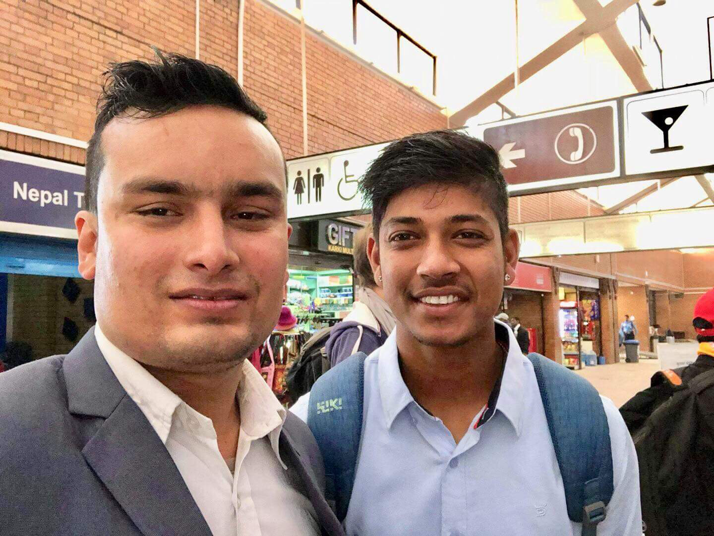 दिल्ली प्रस्थान गर्नुअघि त्रिुभवन विमानस्थलमा सन्दीप लामिछाने (दायाँ) । तस्बिर :सौरभ ओझाको फेसबुकबाट