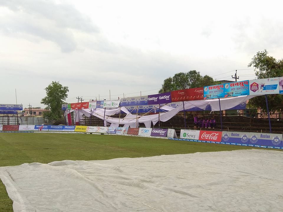 शुक्रबार राति परेको वर्षाका कारण मैदानमा पानी जमेपछि खेल हुन नसकेको हो । मैदानमा बिहानैदेखि पानी सुकाउने क्रम जारी रहेपनि खेल खेलाउन योग्य हुन सकेन ।