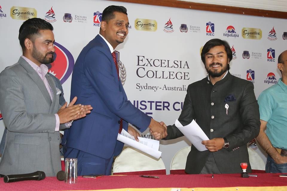 काठमाडौं (हाम्रो खेलकुद)– प्रधानमन्त्री कप एक दिवसिय क्रिकेट प्रतियोगितार्लाइ अस्ट्रेलियाको एक्सेल्सिया कलेजले मुख्य प्रायोजन गरेको छ । नेपालयका प्रबन्ध निर्देशक सुवास प्रधान र एक्सेल्सियाका मार्केटिङ हेड बबी अब्राहमले शुक्रबार राजधानीमा आयोजित पत्रकार सम्मेलनमा सम्झौता पत्रमा हस्ताक्षर गरे ।