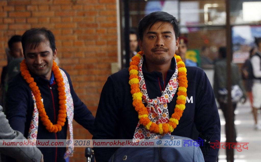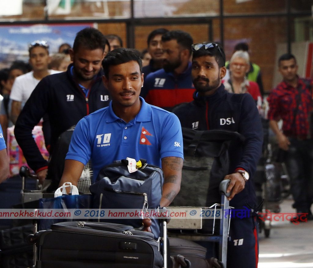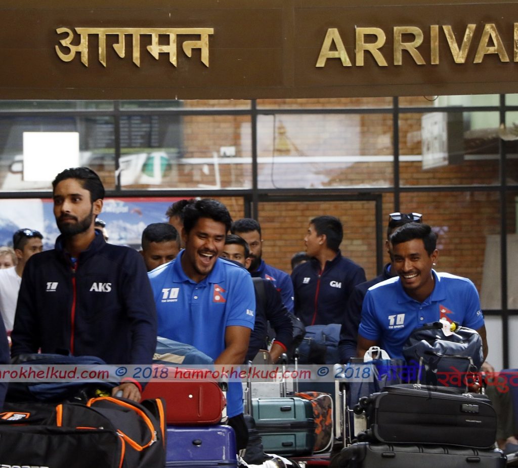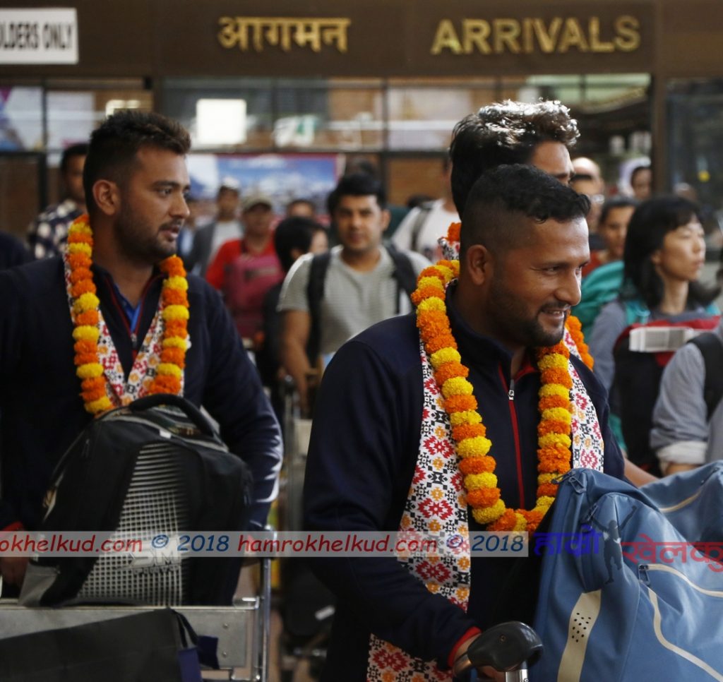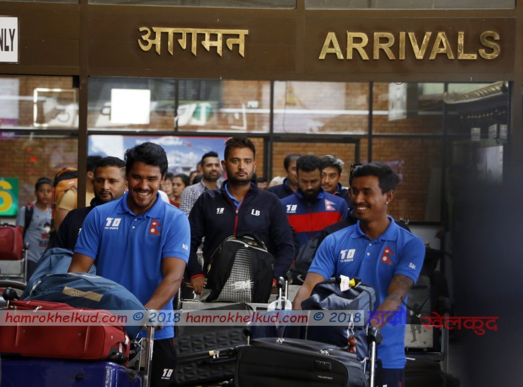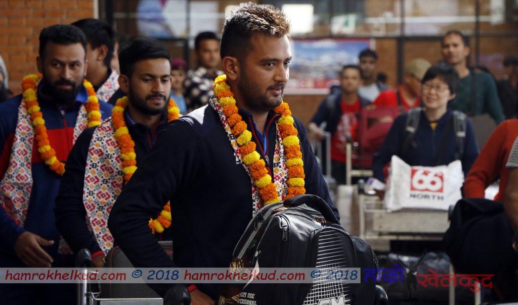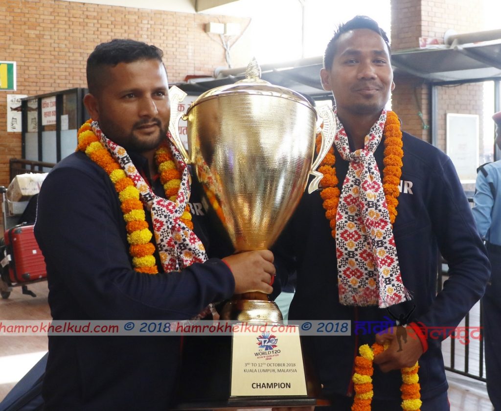 काठमाडौं (हाम्रो खेलकुद) – नेपाली राष्ट्रिय क्रिकेट टोली शनिबार मलेसियाबाट आईसीसी टि-२० विश्वकप छनोट एसिया क्षेत्र समूह ‘बी’ को उपाधि जित्दै घर फर्कियो । नेपाली टोलीको आगमन हुँदा त्रिभुवन अन्तर्राष्ट्रिय विमानस्थलमा देखिएको दृश्यहरु :