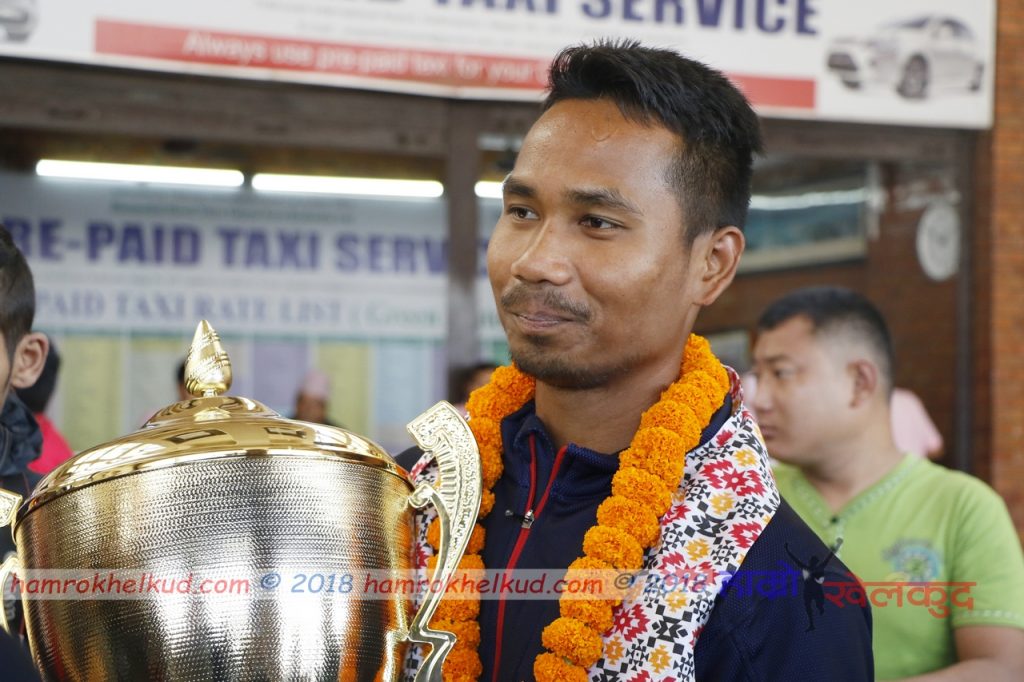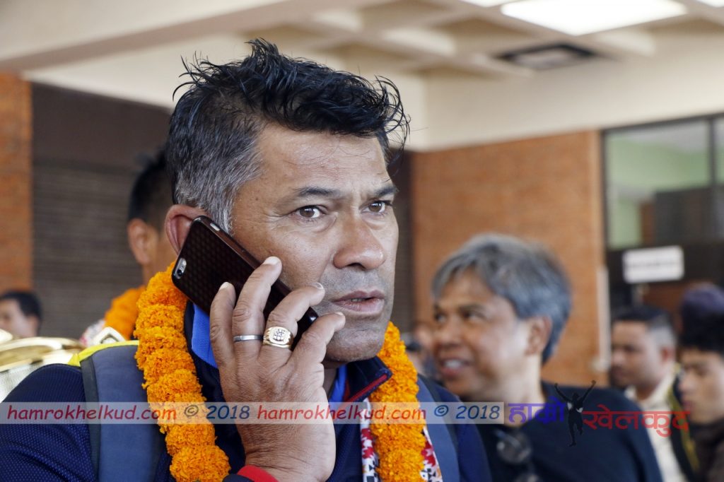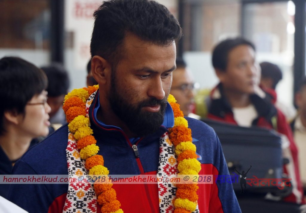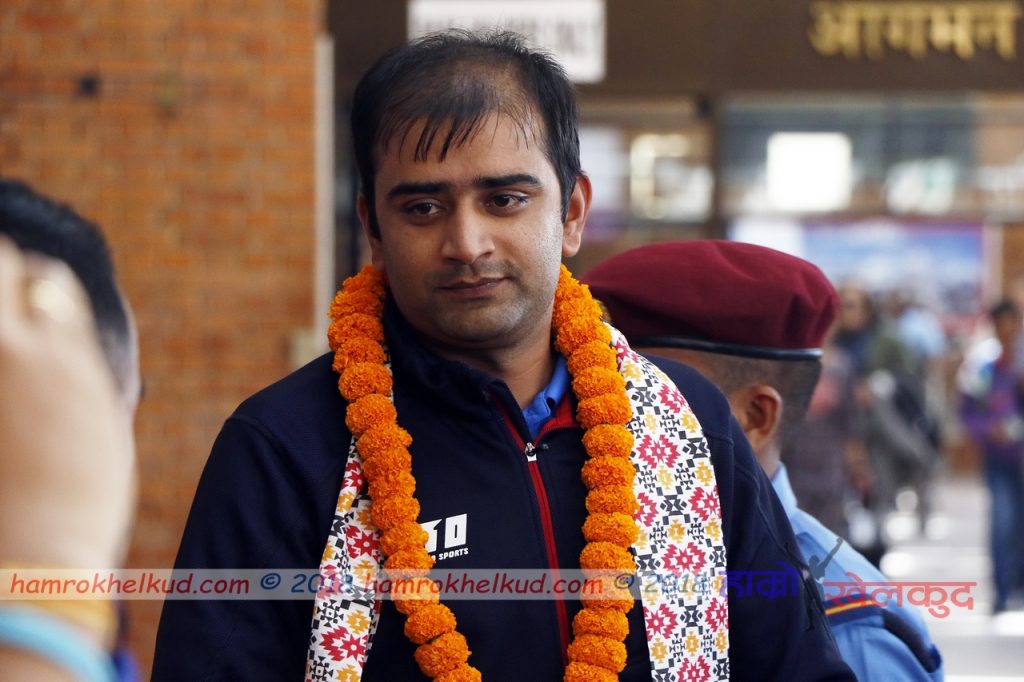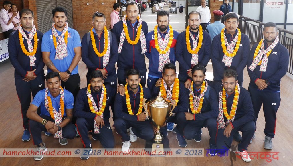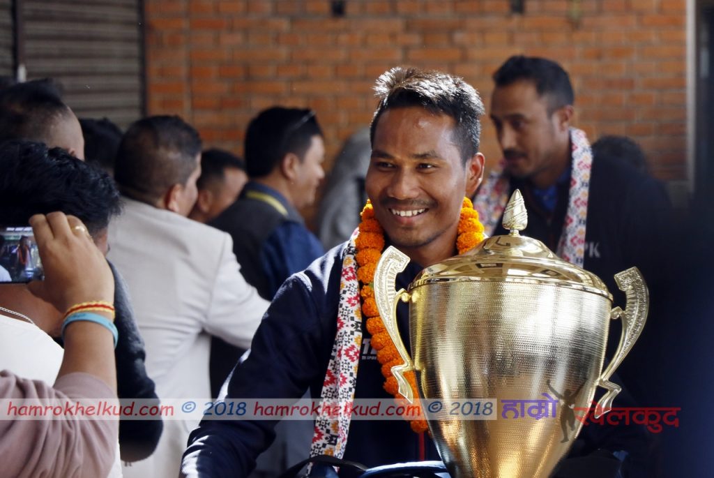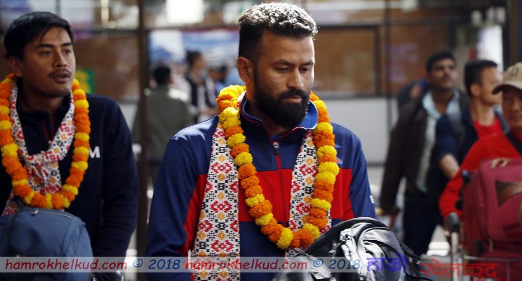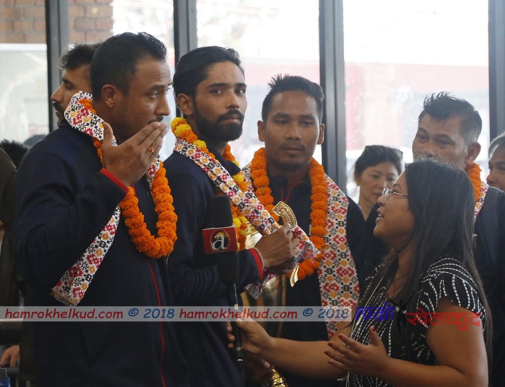 काठमाडौं (हाम्रो खेलकुद) – नेपाली राष्ट्रिय क्रिकेट टोली शनिबार मलेसियाबाट आईसीसी टि-२० विश्वकप छनोट एसिया क्षेत्र समूह ‘बी’ को उपाधि जित्दै घर फर्कियो । नेपाली टोलीको आगमन हुँदा त्रिभुवन अन्तर्राष्ट्रिय विमानस्थलमा देखिएको दृश्यहरु :
