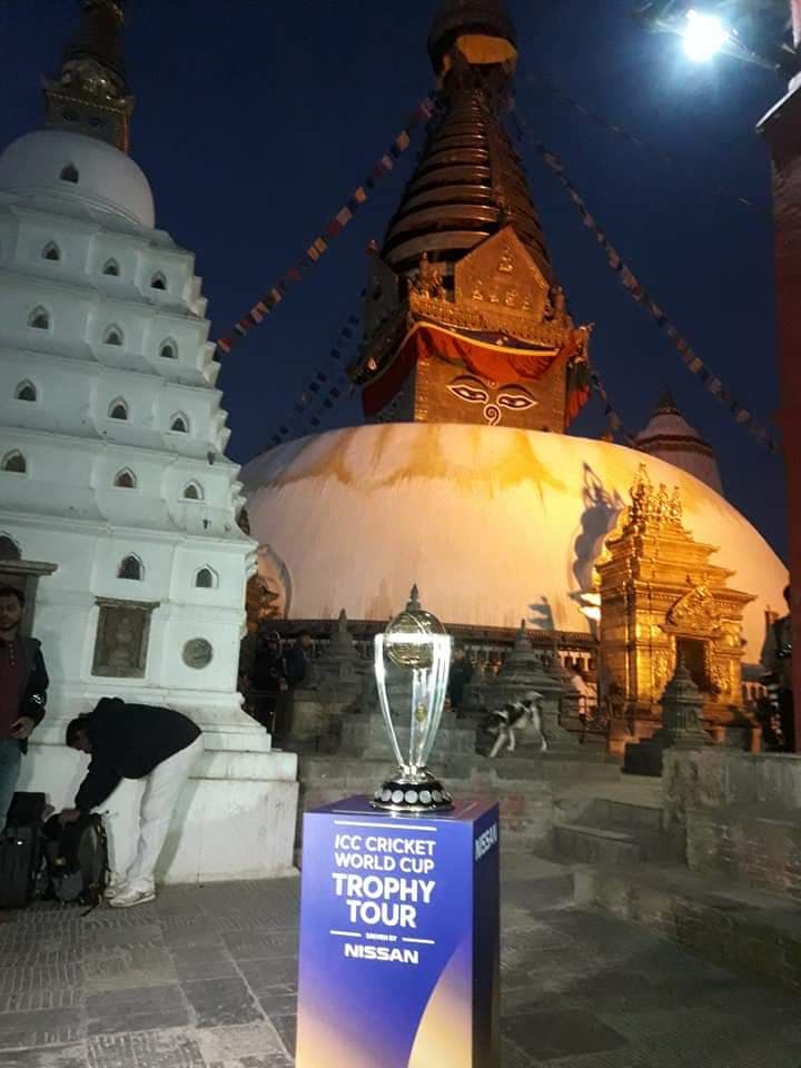 अर्काे वर्ष इंग्ल्यान्ड र वेल्सले संयुक्त रुपमा आयोजना गर्न लागेको एक दिवसीय विश्वकप अघिको ट्रफीलाई ‘विश्व टुर’ अन्तरगत शुक्रबार दिउसै नेपाल ल्याइएपनि साँझ मात्रै ट्रफीलाई स्वयम्भुमा प्रदर्शन गरिएको थियो ।
