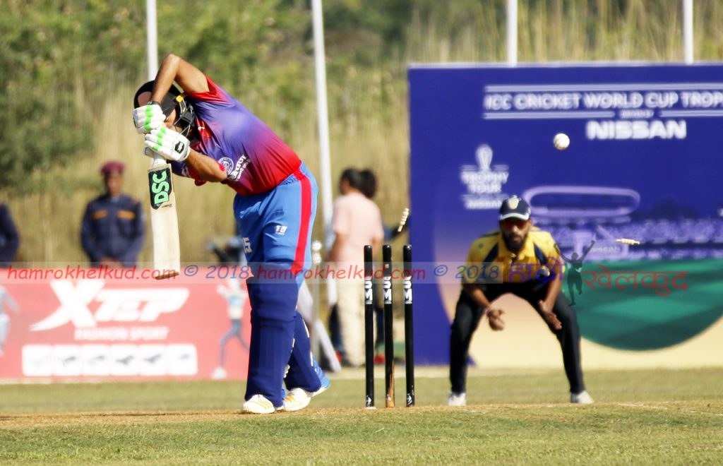 ओपनर चिराग सुरी १ तथा भीन सार्की २ रनमा पभेलियन फर्किए । रोहन मुस्ताफा शुन्य रनमा आउट आउट भए । नेपाली राष्ट्रिय क्रिकेट टिमका बलर करण केसीले आफ्नो स्पेलको पहिलो ओभरको पाँचौ र छैटौ बलमा चिराग सुरी र रोहन मुस्ताफालाई लगातार आउट गरेका थिए । रामनरेश गिरी र शक्ति गौचनले समान १ विकेट बाँडे ।