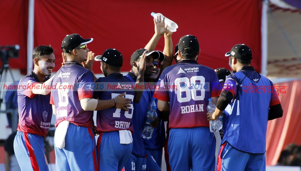 त्यसअघि भीम सार्कीलाई ३५ रनमा छँदा विनोद भन्डारीले ड्रप गरेका थिए । चिराग सुरी ५ र सागर पुन २ रनमा पेभेलियन फर्किए । सिद्धान्त लोहनीले १३ रनको योगदान दिए । सोमपाल कामीले ८ बलमा २२ रन जोडे । उनले २ चौका र १ छक्का प्रहार गरे । पोखराका मोहमद नाविदले ३ तथा मेहबुव आलम, ललित नारायण राजवंशी र कप्तान शरद भेषवाकरले १-१ विकेट लिए ।