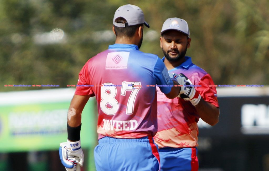 पहिलो ओभरको दोस्रो बलमै कुशल भुर्तेल आउट भएपछि रवि इन्दर र आसिफले दोस्रो विकेटको लागि ५७ रनको साझेदारी गर्दै टिमलाई जिततर्फ अग्रसर गराएका थिए । दोस्रो विकेटको रुपमा आसिफ शेख १२ रनमा आउट हुदा टिमले ६५ रन जोडेको थियो । मोहम्मद नविद आक्रामक २५ रनमा आउट भए । उनले १४ बलमा १ चौका र ३ छक्का प्रहार गरे । चितवनका भुवन कार्कीले २ तथा सन्नी पटेल र करण केसीले समान १ विकेट लिए ।