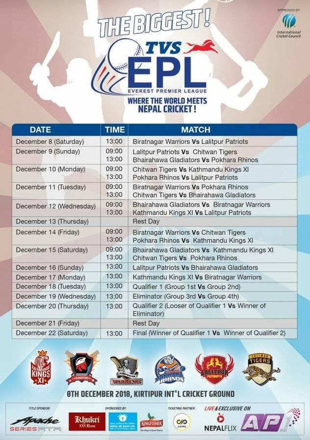 काठमाडौँ – एभरेस्ट प्रिमियर लिग (ईपीएल) को तेस्रो संस्करण डिसेम्बर ८ गते देखी २२ सम्म टीयू क्रिकेट मैदानमा हुँदैछ । प्रतियोगिताको खेल तालिका सोमबार सार्वजनिक भएको छ ।