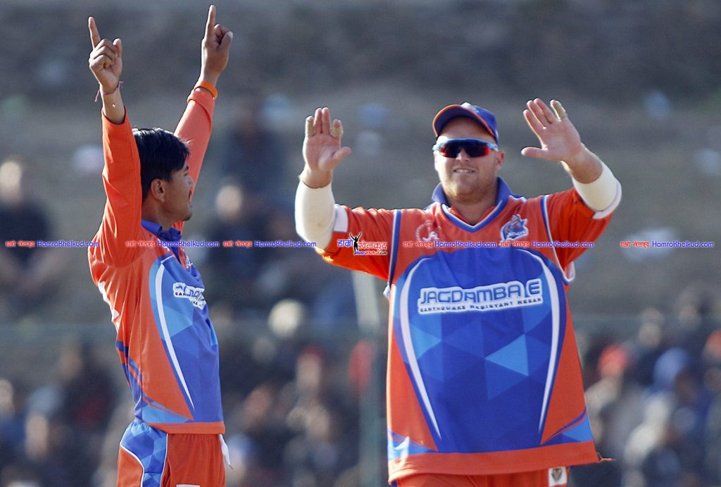 चौथो ओभरमा विक्रम शोवले विकेटकीपर बिनोद भण्डारीको हातबाट क्याच गराउँदै श्रेष्ठलाई ११ रनमा पेभिलिएन फर्काए । मुस्तफालाई शुसन भारीले नवौं ओभरको अन्तिम बलमा कप्तान काइल कोट्जरको हातबाट क्याच गराउदैँ ४० रनमा आउट गरे । मुस्तफाले ३१ बलमा ७ चौका प्रहार गरे । लगतै सागर पुनलाई ९.२ ओभरमा शक्ति गौचनले बोल्ड आउट गरेपछि पोखरा खेलमा फर्किन सक्ने संकेत देखाएको थियो ।