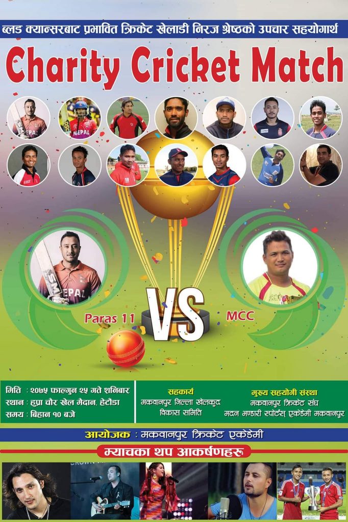 मकवानपुरका स्थानिय पूर्व क्रिकेट खेलाडी तथा प्रशिक्षक निरज श्रेष्ठको सहयोगार्थ च्यारिटी खेल अायोजना गर्न लागिएको हो । मकवानपुरमा क्रिकेट स्थापना गर्न महत्त्वपूर्ण भूमिका निर्वाह गरेका श्रेष्ठ ब्लड क्यान्सरबाट ग्रसित छन् । उनको दोस्रो पटक ‘बोन म्यारो ट्रान्सप्लान्ट’ गर्न लागिएको हो । ३५ वर्षीय श्रेष्ठ एक वर्षदेखि उपचाररत छन् । कार्यक्रम संयोजक अनुप सेनोरियाले सहयोग स्वरुप ५ लाख रुपैयाँ प्रदान गर्ने घोषणा गरिसकेका छन् ।