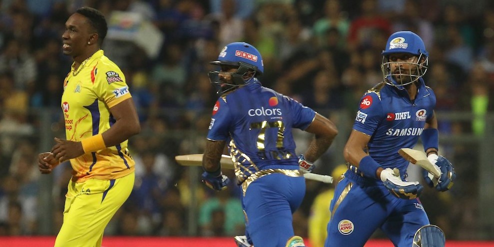 अन्तिम ओभरमा ब्राभोलाई पोलार्डले तेस्रो बलमा छक्का,पान्ड्याले चौथो बलमा छक्का,पाँचौ बलमा चौका प्रहार र अन्तिम बलमा छक्का प्रहार गर्दै २९ रन बटुलेपछि मुम्बई बलियो अवस्थामा पुग्यो । चेन्नईका लागि मोहित शर्मा,इमरान ताहिर,रविन्द्र जडेजा,ड्वेन ब्राभो र दिपक चाहारले समान एक विकेट लिए ।