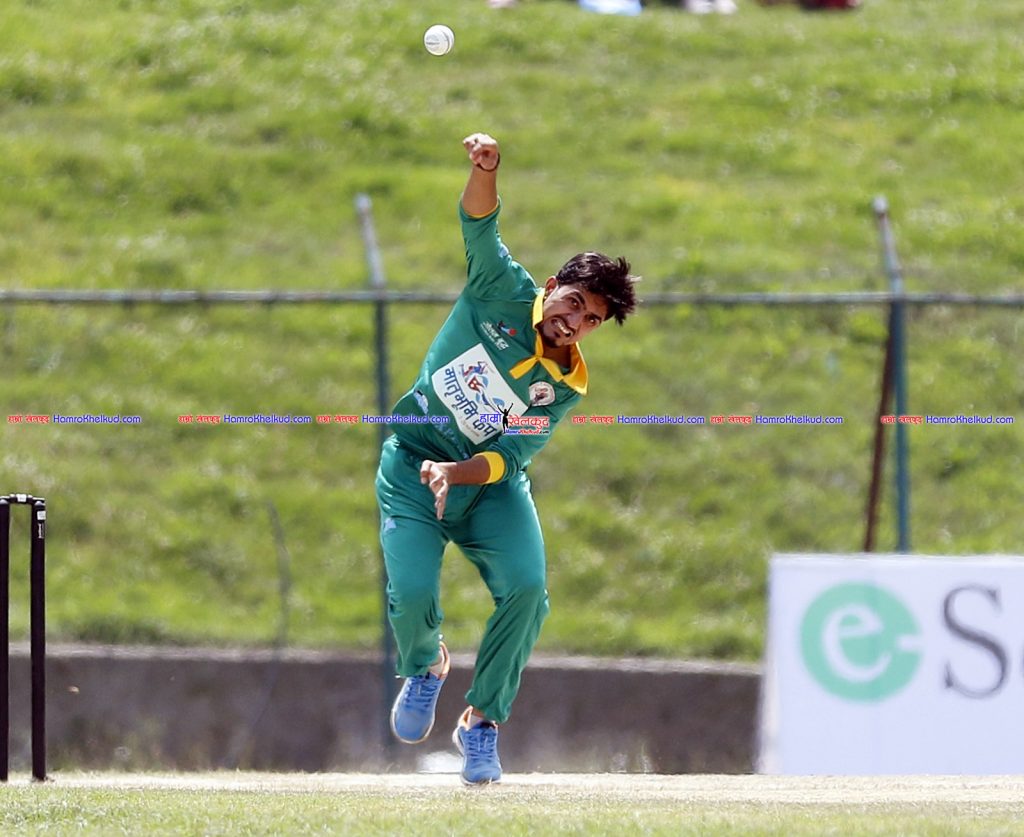 कप्तान पारस र शरदलाई सुसन भारीले बोल्ड आउट गरे । त्यस्तै महर्जन र बास्कोटा भारीको एलबीडब्लू शिकार बने । सुसन भारीले ४ ओभरमा १८ रन खर्चेर ४ विकेट लिए । त्यस्तै करण केसी, दिपेन्द्र सिंह ऐरी र जितेन्द्र मुखियाले समान १ विकेट हात पारे । भारीनै म्यान अफ द म्याच चुनिए ।