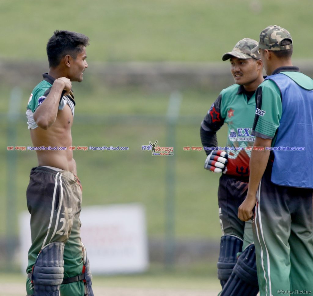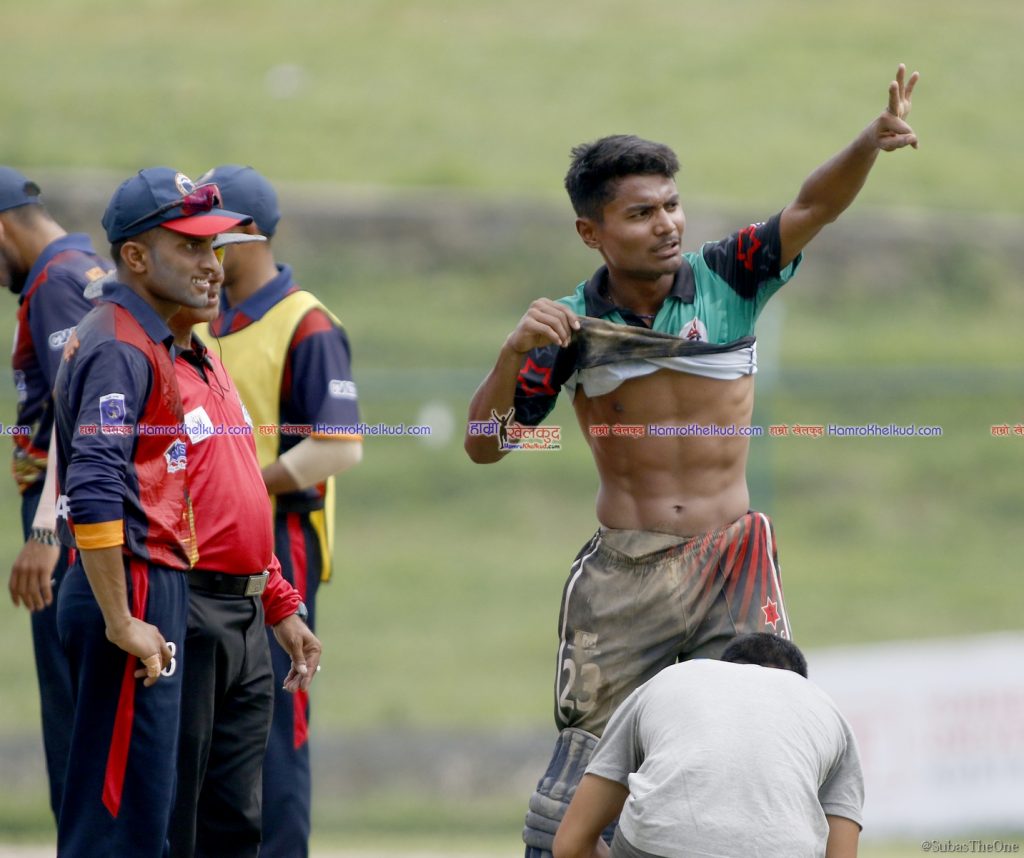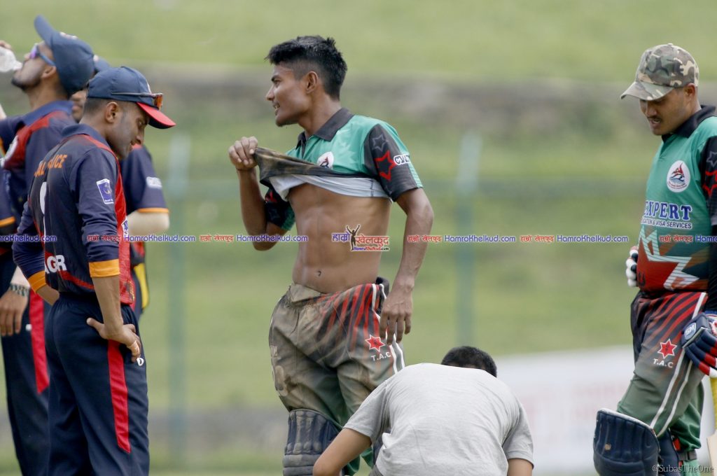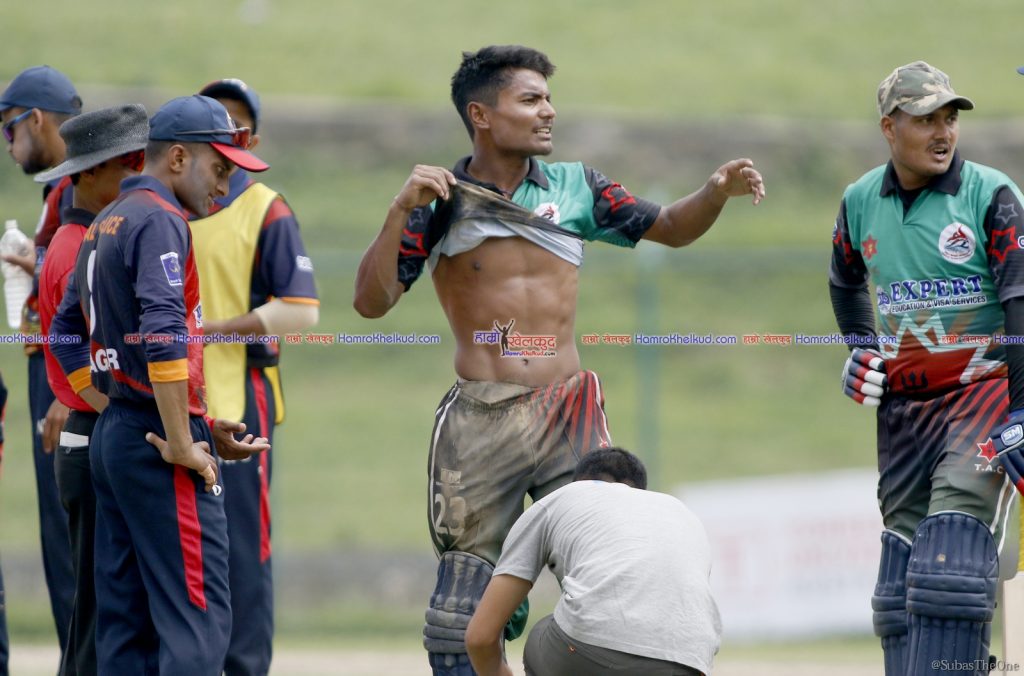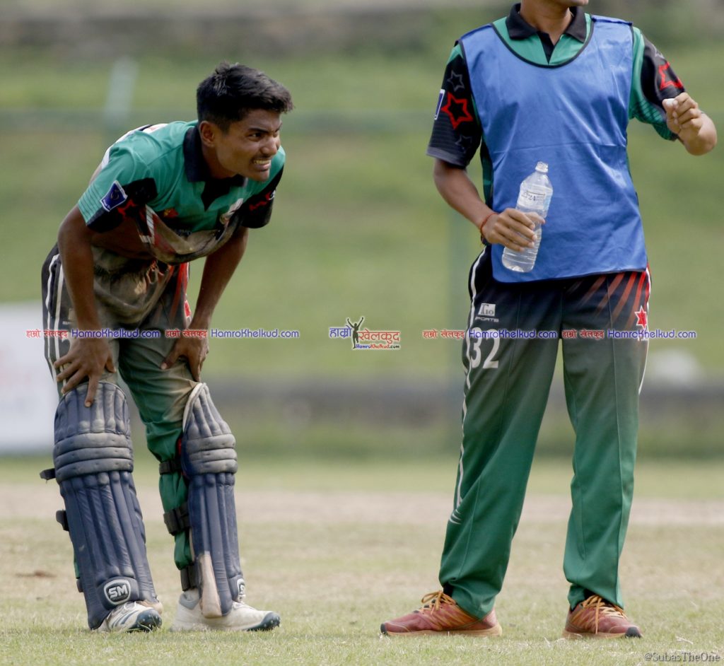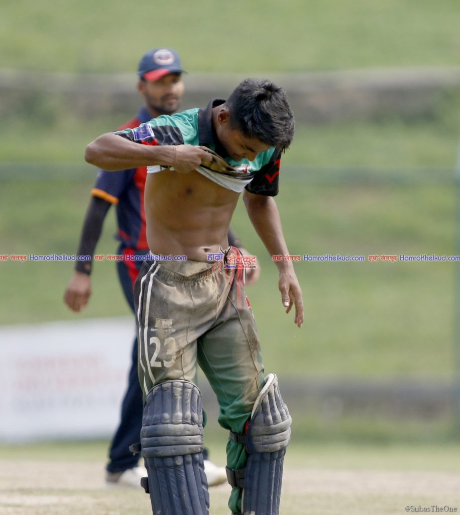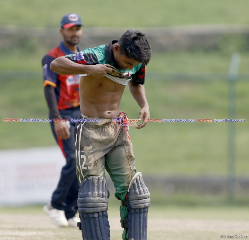 खेलको २८ औं ओभरको दोस्रो बलमा हरिबहादुर चौहानले फाइन लेगतर्फ सट प्रहार गरे । आरिफ शेखले बाउन्ड्रीनिर उत्कृष्ट फिल्डीङ गर्दै विकेटकिपर दिलिप नाथसम्म राम्रो थ्रो गरे । दिलिपले पनि स्टम्पको बेल खसाले तर रोहितले फुल लेन्थ डाइभ हान्दै समयमा क्रिजभित्र पसे । तर यसो गर्ने क्रममा उनको छातीमा चोट लाग्न पुग्यो ।