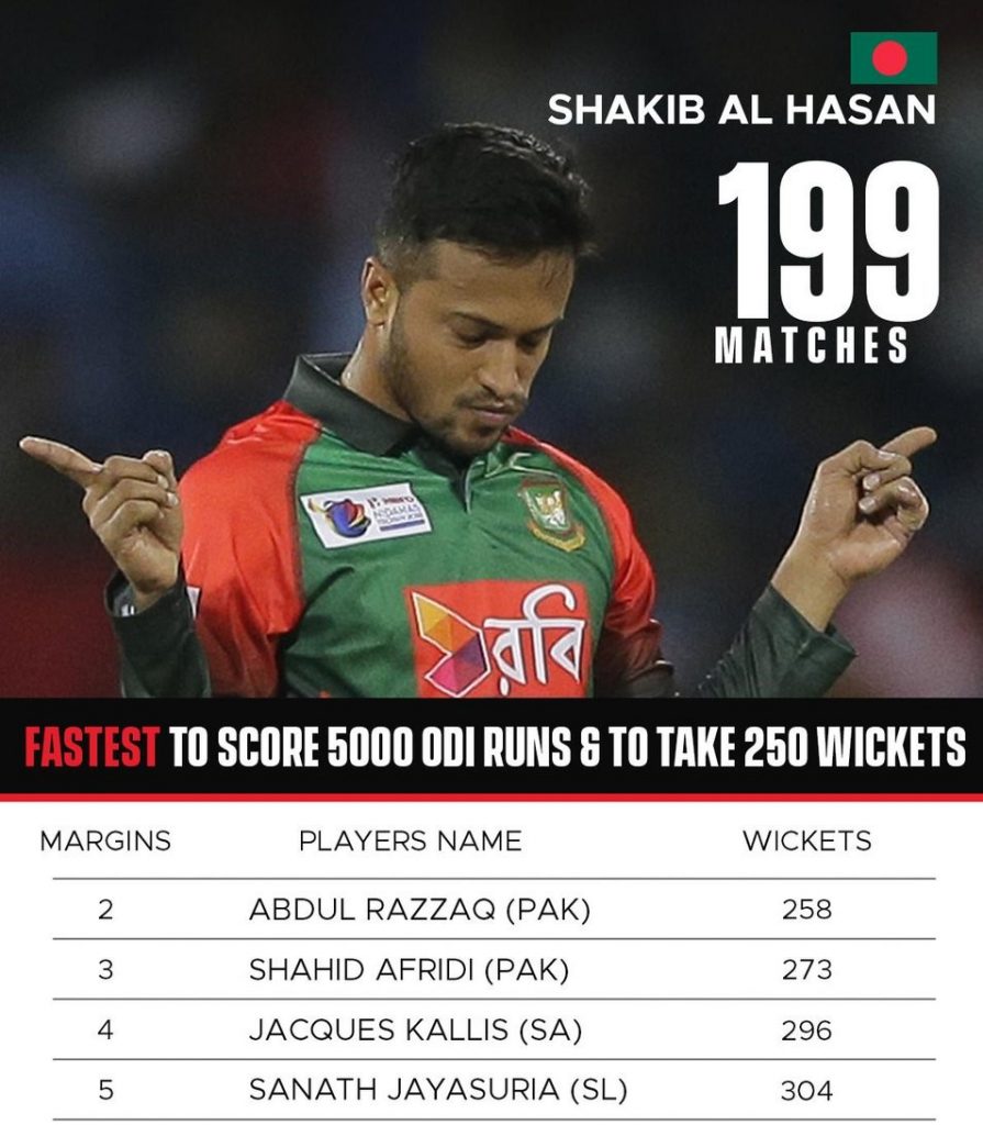 सकिब वान डे खेलमा सर्वाधिक छिटो ५ हजार रन र २ सय ५० विकेट लिने पहिलो खेलाडी बनेका छन् । सकिबले यो उपलब्धी मात्र १ सय ९९ खेलमा हासिल गरे । आईतबार दक्षिण अफ्रिकाविरुद्ध २० ओभरको चौथो बलमा सकिब अल हसनले एडेन मार्करामलाई ४५ रनमा बोल्ड आउट गर्दै आफ्नो २ सय ५० विकेट पुरा गरेका थिए ।