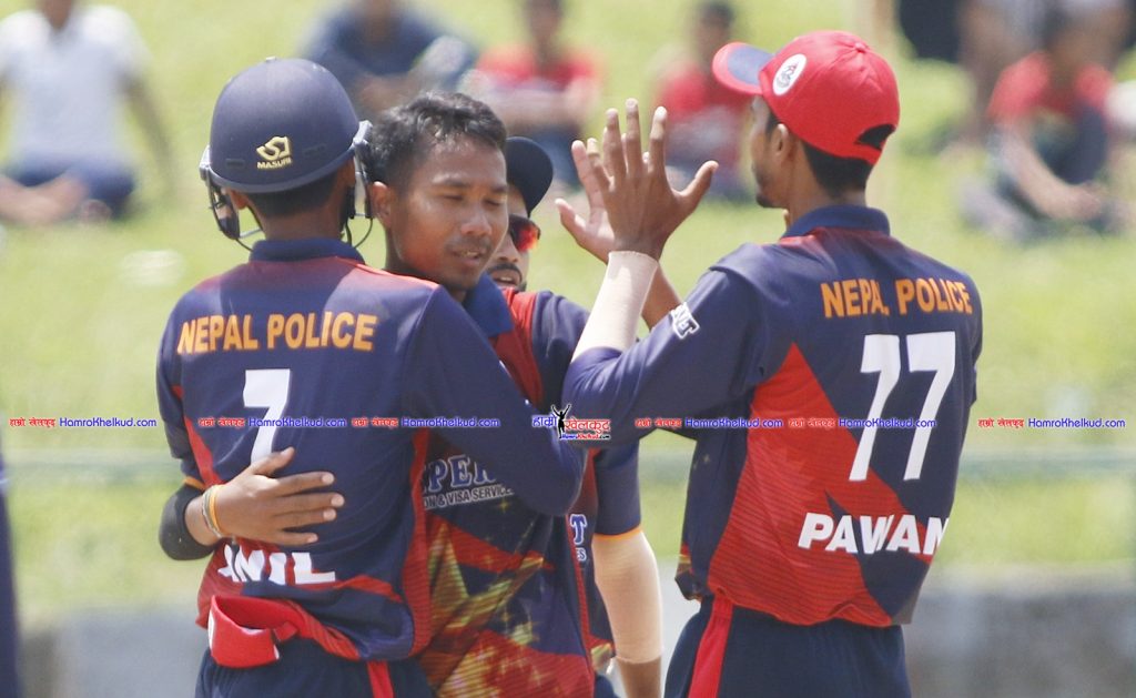 ओपनर सोमपाल कार्मी र राजु रिजालले पहिलो विकेटका लागि १५.५ ओभरमा ७२ रनको साझेदारी गर्दै राम्रो सुरुवात गर्दै ठूलो योगफलको संभावना देखाएका थिए । ललित नारायण राजवंशीले सोमपाललाई पवन सरार्फबाट क्याच आउट गर्दै ३५ रनमा पेभिलिएन फर्काएपछि पुलिस खेलमा फर्किएको थियो ।