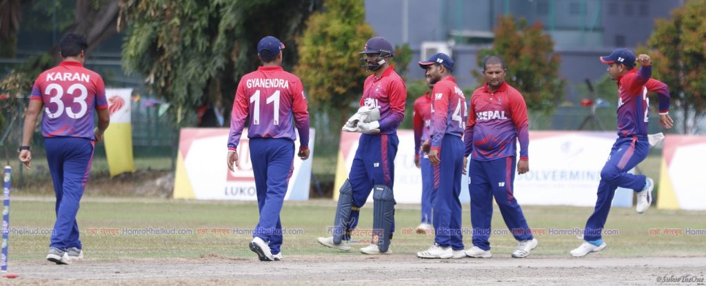 छैटौं ओभरको अन्तिम बलमा कप्तान पारस खड्का ठूलो सट खेल्ने धुनमा क्याच आउट भएसँगै नेपालको विकेट पतन सुरु भएको थियो । जुन विकेटपतन यात्रालाई कुनै पनि ब्याट्सम्यानले रोक्न सकेनन् । नवौं ओभरको दोस्रो बलमा तमोर शज्जादले ज्ञानेन्द्र मल्ललाई २३ रनमा आउट गरे । ११ औं ओभरको पहिलो बलमा शरद भेषवकर ७ रनमा आउट भए । १४ औं ओभरको पाँचौ बलमा सोमपाल कामी ११ रनमा रन आउट भए ।
