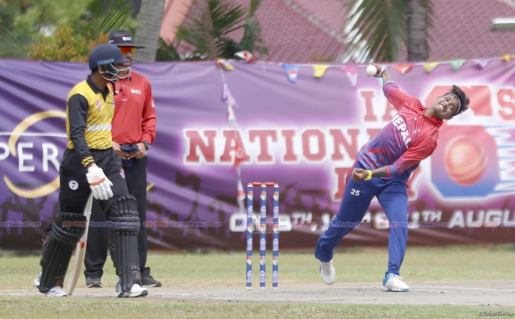 तीब्र गतिका बलर सोमपाल कामीले उत्कृष्ट पर्दशन गरे । सोमपालले पहिलो बलमै ओपनर अनवार अरुद्दीनलाई शुन्यमा क्याच आउट गराए । सोमपालले अन्तिम बलमा शफिक शरार्फलाई शुन्यमा एलवी डब्लू आउट गर्दै सुरुवाती समय दबाबमा राख्न सफल भए । तेस्रो ओभरमा सुरुवाती तीन चौका लगातार खर्चिए । तर सोमपालले अन्तिम बलमा अमिनुद्दीन रामलीलाई १ रनमा बोल्ड आउट गर्दै शीर्षक्रममा तीन ब्याट्सम्यानलाई पेभिलिएन फर्काएका थिए ।