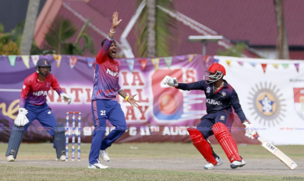 उस्मान शून्य र बिलाल १३ रनमा आउट भए । त्यस्तै सन्दीपले तल्लोक्रमका शिराज खानलाई पनि शुन्यमा बोल्ड आउट गर्दै कुवेतलाई सस्तैमा रोक्न महत्वपूर्ण योगदान दिए । सन्दीपले ४ ओभरमा २१ रन खर्चेर ३ विकेट लिए
