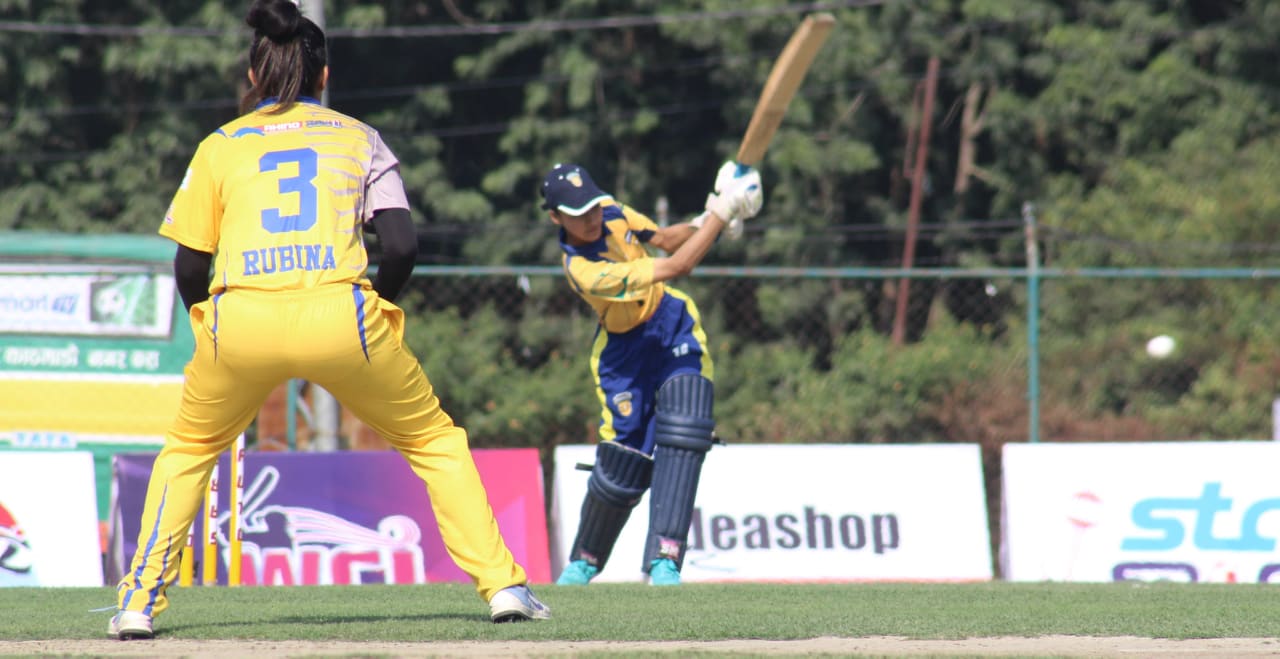 छैटौं ओभरको तेस्रो बलमा रेखा रावलले बोल्ड आउट गर्नु अघि उनले २५ बलमा ७ चौका प्रहार गरिन् । रेखाले आठौं ओभरको पाँचौ बलमा अर्की ओपनर शोभा आलेलाई ९ रनमा बोल्ड आउट गरिन् । अप्सरी बेगम ६ रनमा क्याच आउट हुदा कप्तान रुविना क्षेत्री वेलाबासी नवौं ओभरको पाँचौ बलमा १ रनमा रन आउट भएपछि काठमाडौं दबाबमा परेको थियो ।