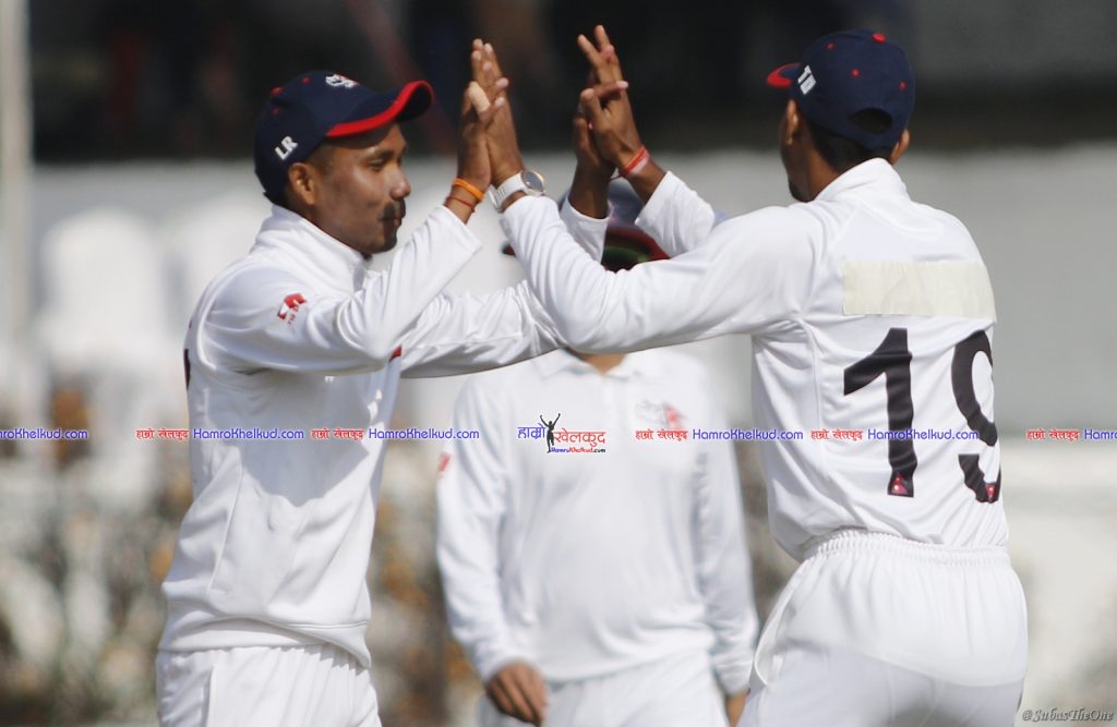 शरदलेनै माईल्स ह्मान्डलाई ५२ रनमा बोल्ड आउट गरे । शरदले ५३ ओभरमा बोल्ड आउट गर्नु अघि माईल्सले ६ चौका र १ छक्का प्रहार गरे । नेपालका शरद भेषवकर र सोमपाल कामीले समान २ विकेट लिएका छन् ।