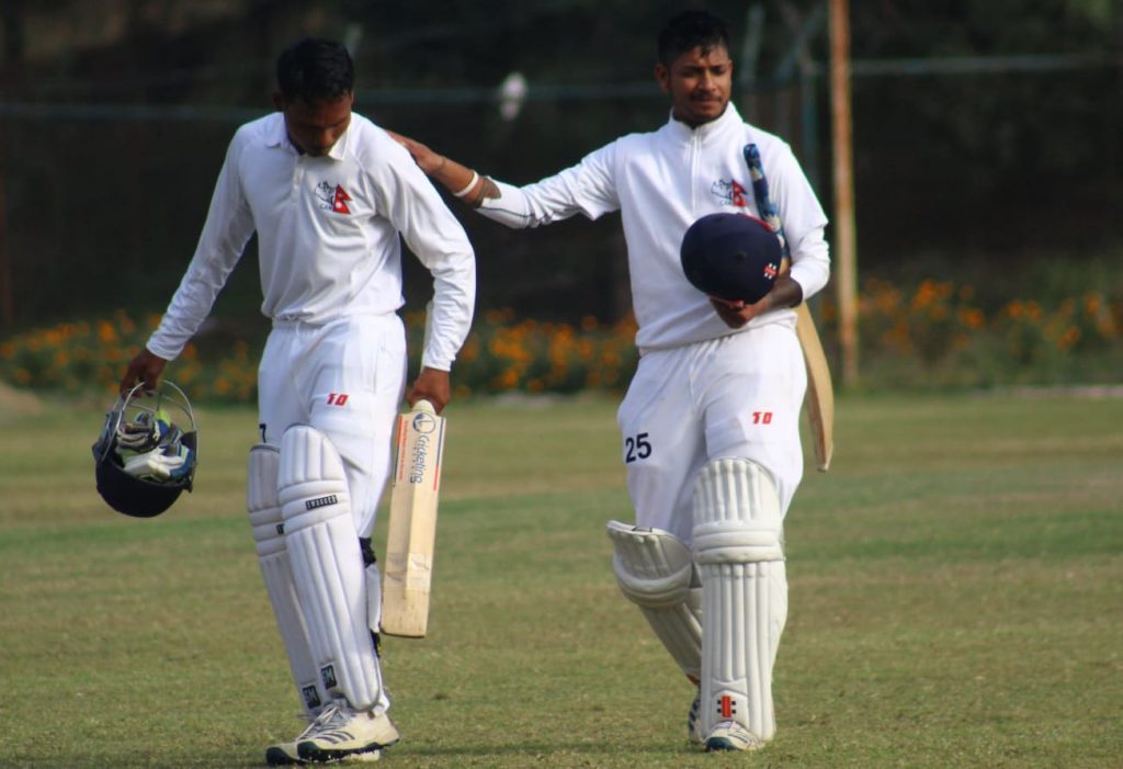 त्यसअघि विहीबारनै पहिलो इनिङमा नेपाल ४४.४ ओभरमा १ सय ५३ रनमा अल आउट भएको थियो । लेग स्पिनर सन्दीप लामिछानेले ३९ रनमा अविजित रहे । अन्तिममा सन्दीपले २१ बलमा ४ छक्का र २ चौका प्रहार गर्दै खेललाई रोमान्चक बनाएका थिए । अन्तिम विकेटका लागि सन्दीप र ललित नारायण राजवंशीबीच ४२ रनको साझेदारी भएको थियो ।