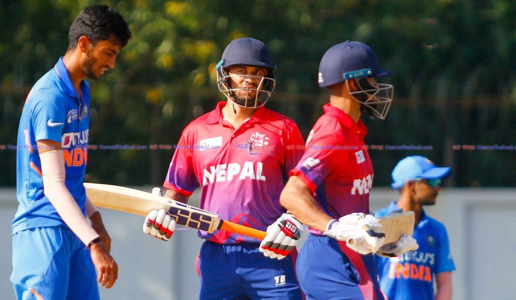 १८ ओभरको चौथो बलमा पार्थ रेखाडेले बोल्ड आउट गर्नुअघि यसै खेलबाट नेपाली टोलीमा डेब्यू गरेका कुशलले ६० बलमा ४ चौका सहित २८ रनको योगदान दिए । पार्थले नै २० ओभरको पहिलो बलमा आरिफ शेखलाई २ रनमा क्याच आउट गराए । २९ ओभरको दोस्रो बलमा यश राठोडले सिद्धार्थ देसाईबाट उप कप्तान दीपेन्द्र सिंह ऐरीलाई २४ रनमा क्याच आउट गराए । ऐरीले ३१ बलमा ३ चौका प्रहार गरे ।