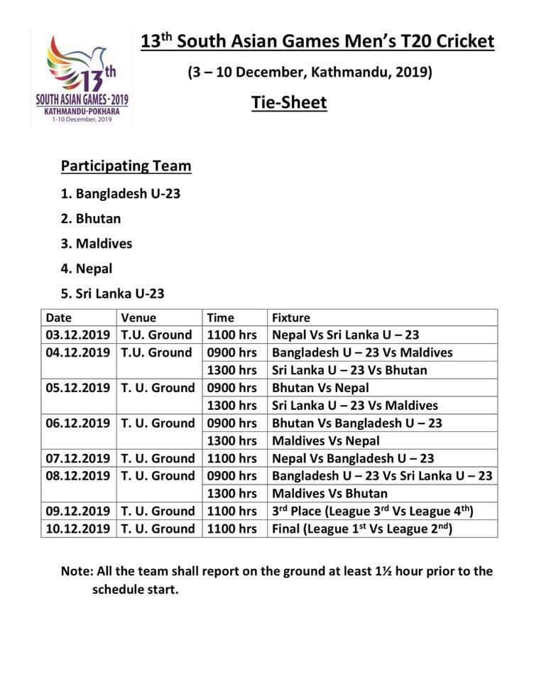 काठमाडौं (हाम्रो खेलकुद) – आसन्न १३ औं दक्षिण एसियाली खेलकुद (साग) अन्तर्गत पुरुष टि ट्वान्टी क्रिकेटको खेल तालिका सार्वजनिक भएको छ । साग पुरुष क्रिकेट प्रतियोगितामा दुई टेष्ट राष्ट्रसहित ५ टोलीको सहभागिता रहनेछ ।