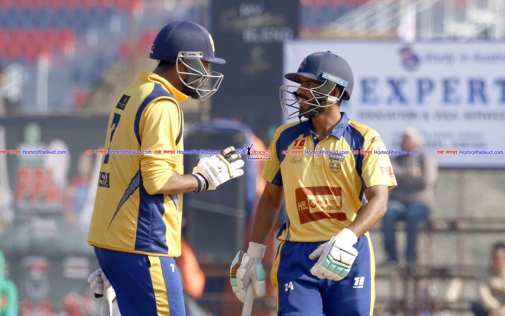 सामान्य योगफलतर्फ अग्रसर चितवनलाई यी दुईको ब्याटिङले बलियो योगफलमा पुर्याएको थियो । तेस्रो ओभरको पाँचौ बलमा जितेन्द्र मुखियाले ओपनर रोहन मुस्तफालाई विकेटकीपर राजु रिजालबाट ७ रनमा क्याच आउट गराए । मोहम्मद जैद आलमको ११ औं ओेभरको पाँचौ बलमा ठूलो सट खेल्ने धुनमा कप्तान पारस खड्का नोमन खानबाट ३५ रनमा समातिए । पारसले ३८ बलमा ५ चौका प्रहार गरे । दोस्रो विकेटका लागि पारस र बाबर हायतले ४७ रनको साझेदारी गरेका थिए ।