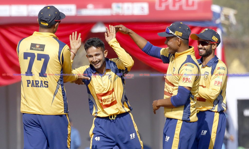 दोस्रो ओभरको पहिलो बलमै सन्नी पटेलले ओपनर मोहम्मद जैद आलमलाई १ रनमा एलबी डब्लू आउट गरे । तेस्रो ओभरको पहिलो बलमा करण केसीले अर्का ओपनर सुनिल धमलालाई विकेटकीपर अनिल कुमार शाहबाट ५ रनमा क्याच आउट गराए । छैटौं ओभरको अन्तिम बलमा भुवन कार्कीले कप्तान प्रदीप ऐरीलाई ९ रनमा बोल्ड आउट गरे । भुवन कार्कीले नै राजु रिजाललाई १ रनमा एलबी डब्लू आउट गरे ।