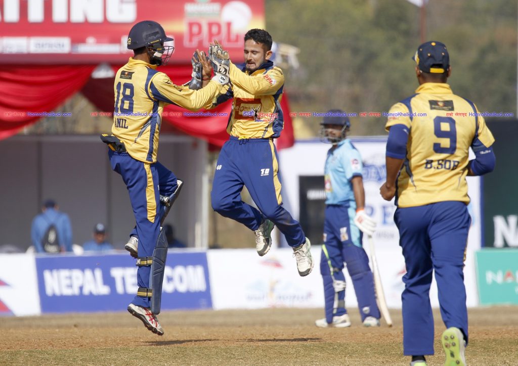 १८ औं ओभरको तेस्रो बलमा रोहन मुस्तफाले पुनितलाई २४ रनमा बोल्ड आउट गरेपनि जित कठिन बनेको थियो । उनले २६ बलमा २ चौका प्रहार गरे । १६ औं ओभरको अन्तिम बलमा सन्नी पटेलले लोकेश बमलाई ४० रनमा रन आउट गर्न चुकेका थिए । लोकेशले ३३ बलमा अर्ध शतक प्रहार गरेका थिए । रोहन मुस्तफाले ४ ओभरमा २१ रन खर्चेर २ विकेट लिए । भुवन कार्कीले ३ ओभरमा १४ रन खर्चेर ३ विकेट लिए । करण केसीले ४ ओभरमा ३३ रन खर्चेर ३ विकेट लिए । सन्नी पटेलको नाममा १ विकेट रह्यो ।