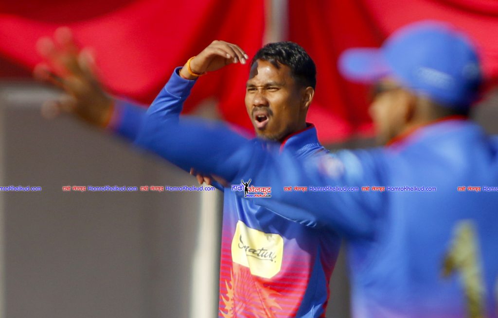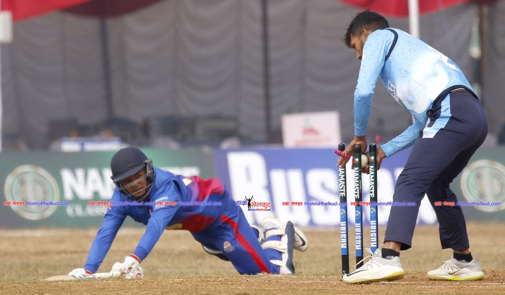 नवौं ओभरको तेस्रो बलमा ठूलो सट खेलेका सन्दीप जोरालाई बाउन्ड्री लाइन नजिकै आशिफ शेखले उत्कृष्ट डाइभ हान्दै २ रनमा क्याच लिए । मञ्जित श्रेष्ठ ९ र अमित यादव ६ रनमा अविजित रहे । प्रथामेश दाके र सर्वजीत लड्डाले २–२ विकेट लिए । ललित नारायण राजवंशीको नाममा १ विकेट रह्यो ।