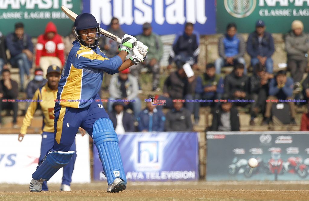 एक एण्डबाट निरन्तर विकेट गुमेपनि अर्कोतर्फबाट कप्तान ज्ञानेन्द्र मल्लले रन जोड्दै आशा कायमै राखेका थिए । तर १३ औं ओभरको पाँचौ पारस खड्काबाट ४० रनमा क्याच आउट गराएपछि काठमाडौंको जितको आशा टाढिएको थियो । ज्ञानेन्द्रले ३९ बलमा ३ चौका र २ छक्का प्रहार गरे । १६ औं ओभरको पाँचौ बलमा पृथु बास्कोटालाई पारस खड्काले रोहन मुस्तफाबाट १८ रनमा क्याच आउट गराए । उनले २३ बलमा २ चौका प्रहार गरे ।