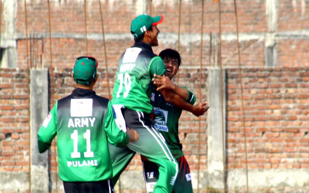 सुशन भारीले ८.३ ओभरमा ३ मेडन सहित १६ रन खर्चेर ७ विकेट लिए । हरि बहादुर चौहान २ र साहब आलमले १ विकेट लिए ।